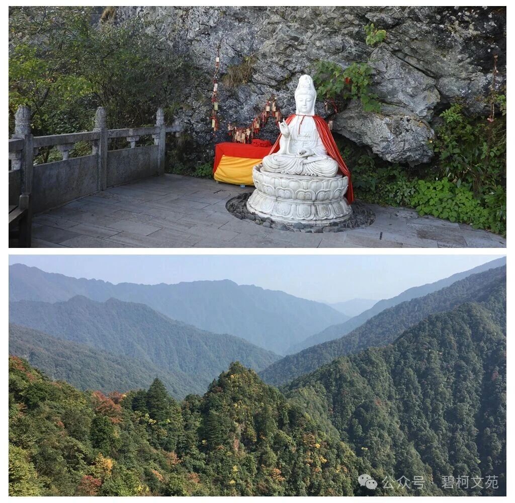2017年秋,我们夫妻俩是在76岁的年纪登上了老金顶。一路上受到这么多游客的鼓励和赞许,不过也是费了九牛二虎之力,有的地段甚至要手脚并用攀爬。下了老金顶后,没有力气、也没有时间再去登新金顶了。虽然与老金顶相比,新金顶海拔略低,但更加险要,更为难爬,只能“望顶兴叹”,在相机镜头中游了。