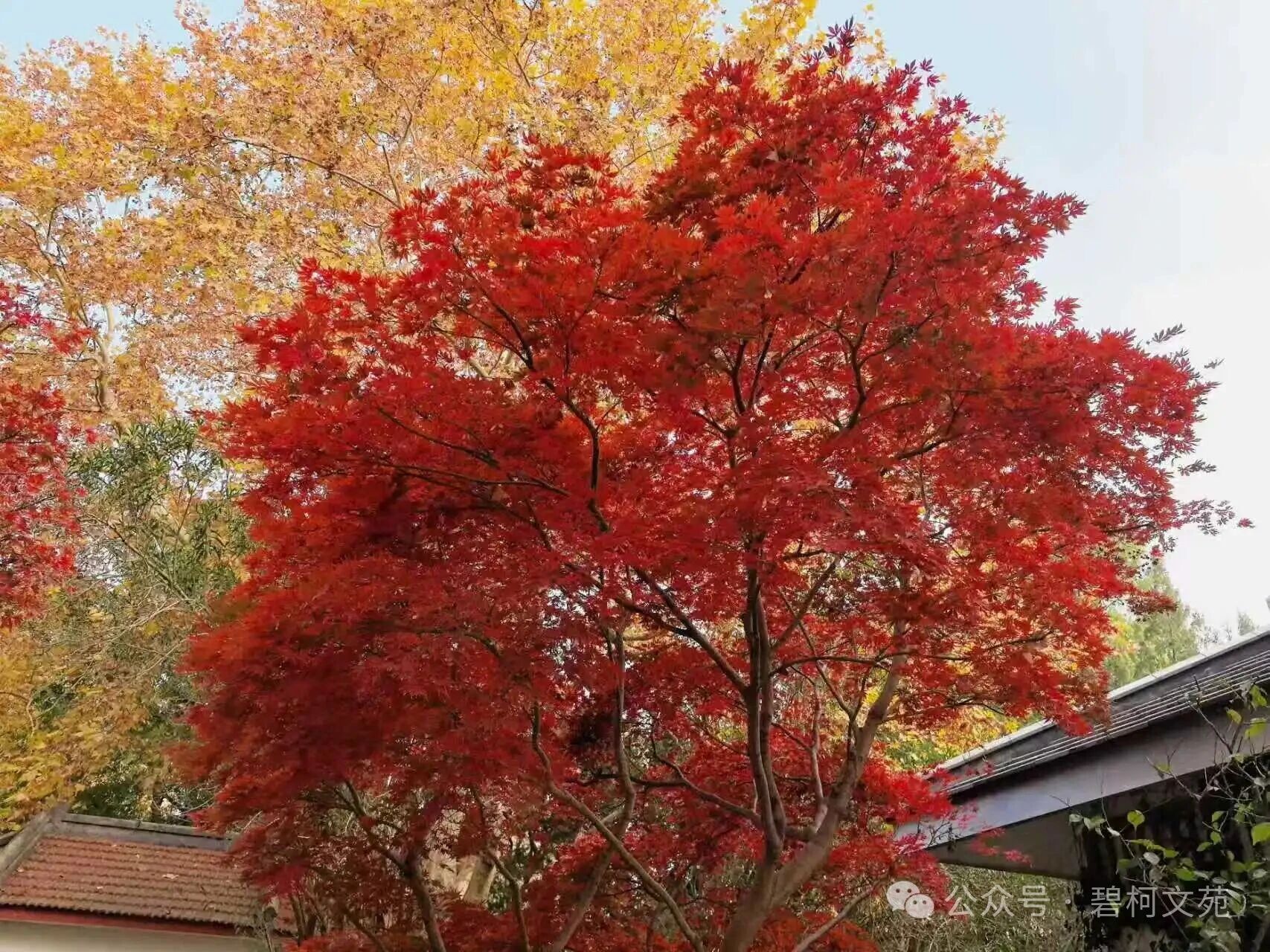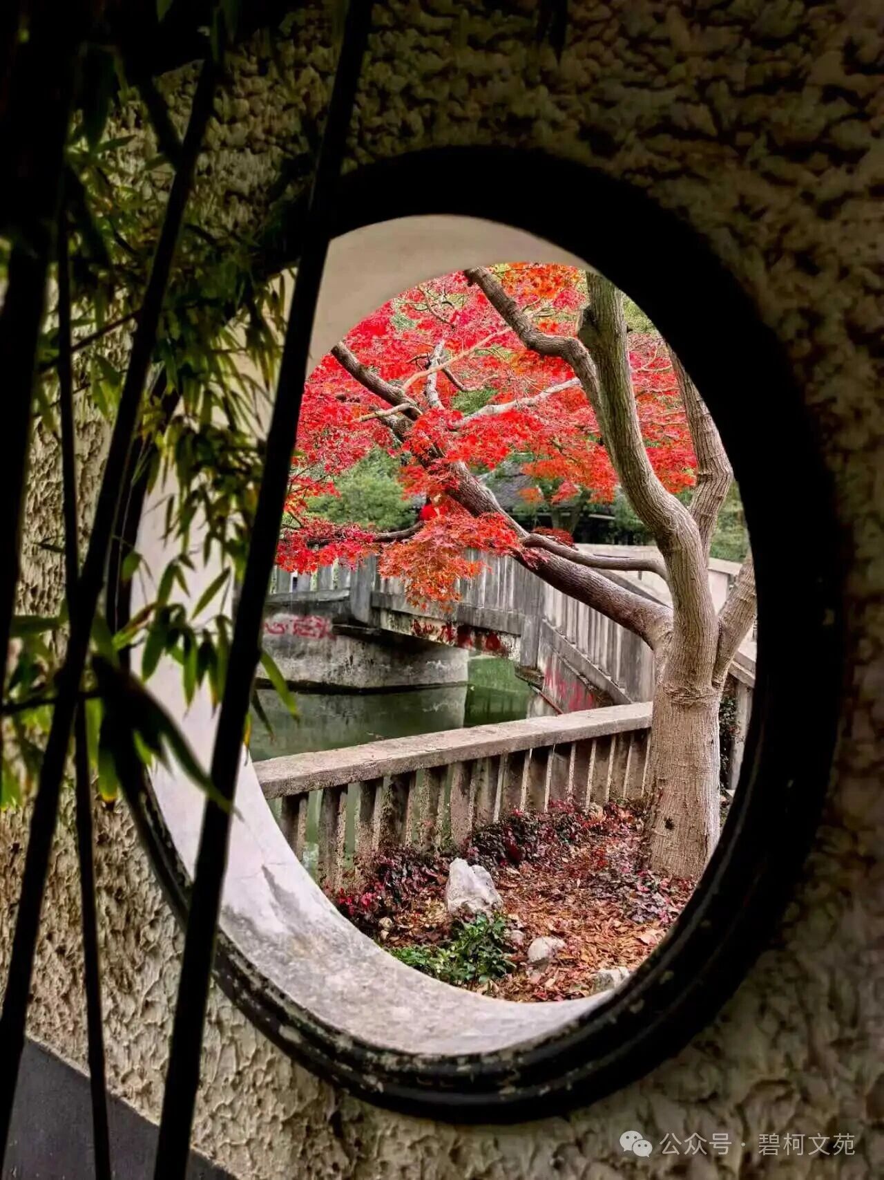 园北的土山之上,红枫与银杏交织成一片绚烂的林海。登高远眺,红叶层层叠叠,从浅红到深红,渐变的色彩让人着迷。偶有几株金黄的银杏点缀其间,红与黄的碰撞,热烈而不失雅致。