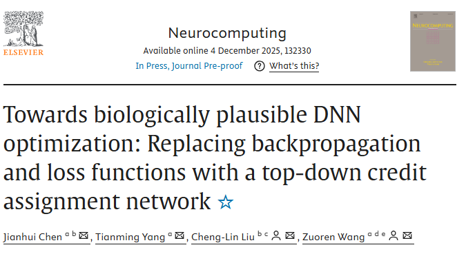 近日,Neurocomputing期刊在线发表了题为《Towards Biologically Plausible DNN Optimization:Replacing Backpropagation and Loss Functions with a Top-Down Credit Assignment Network》的研究论文。该研究由中国科学院脑科学与智能技术卓越中心、脑认知与类脑智能全国重点实验室王佐仁研究组联合中国科学院自动化研究所刘成林研究组共同完成。团队提出了一种全新的类脑学习框架:自顶向下信用分配网络框架(TDCA,Top-Down Credit Assignment Network),首次利用脑启发的自顶向下调控网络,同时替代传统人工智能中的损失函数与反向传播算法,在多种任务中实现了更快收敛、更强稳定性和更低计算成本的学习性能。