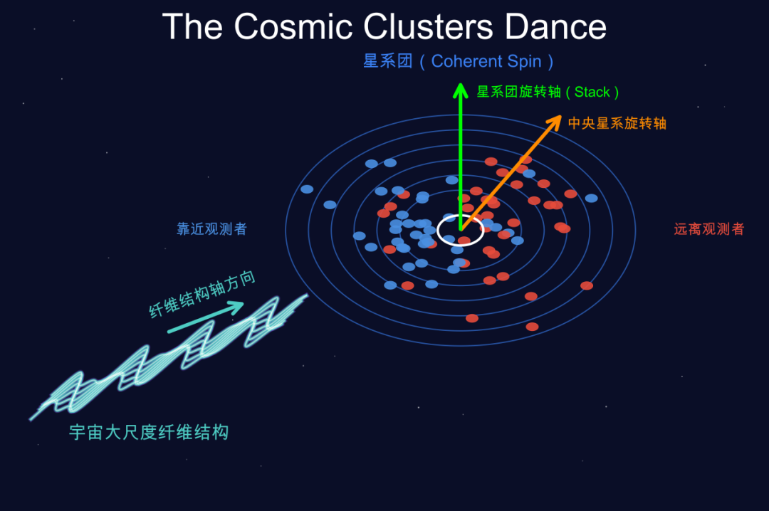 科学卡通图:星系团自旋轴示意图,星系团中存在由内部动力学和大尺度结构共同塑造的显著相干自旋。