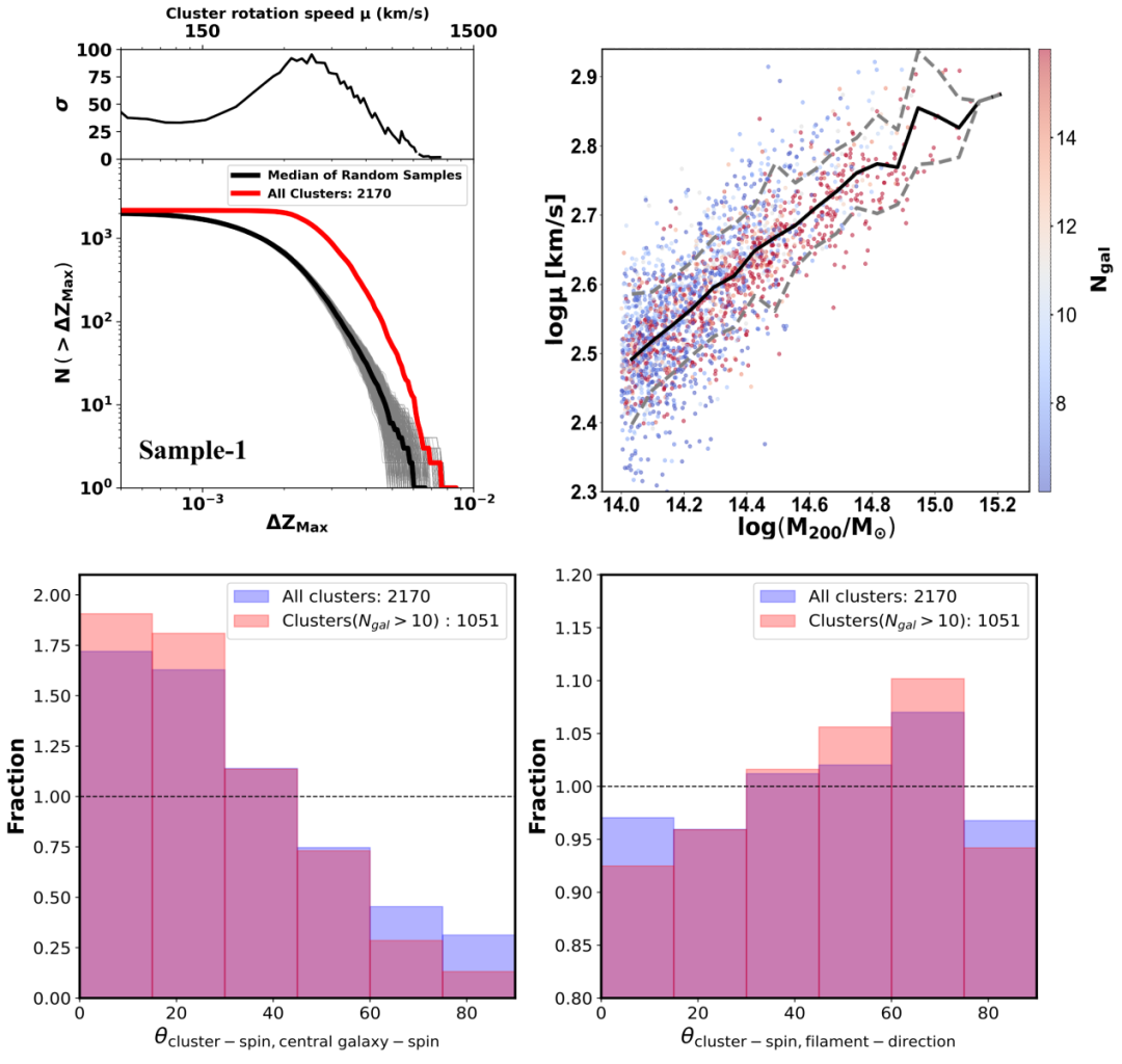 科学结果图,左上图:星系团自旋信号的累积分布;右上图;星系团旋转速度-质量关系;左下图:星系团自旋与中央星系自旋的关联;右下图:星系团自旋与邻近大尺度纤维结构轴的关联。
