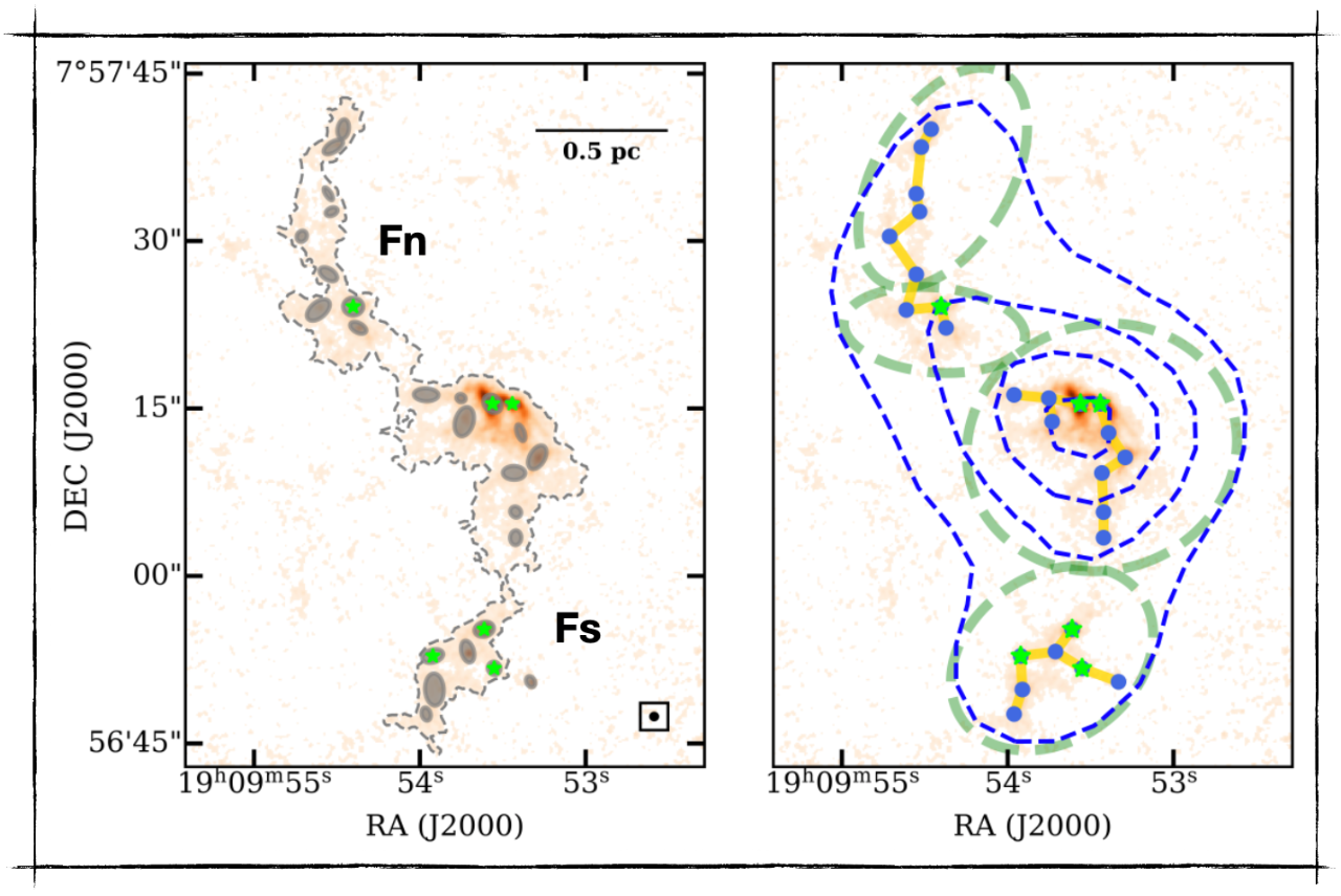 研究进一步揭示了I19074区域整体呈现“丝状结构→团块→云核”的多尺度碎裂模式,但Fn与Fs两个子区域表现出不同的碎裂机制。Fn与电离氢区相互作用,呈现典型的“壳层碎裂”特征,形成三个间距约1秒差距的团块,符合电离氢区膨胀驱动的“聚集—坍缩”模型;而Fs仅在丝状结构末端形成一个团块,符合“末端坍缩碎裂”机制,即由引力不稳定主导的局部坍缩导致碎裂。值得注意的是,无论Fn还是Fs,其内部团块中云核的平均间距均约为0.17秒差距,可用近似球对称的金斯碎裂机制解释,说明团块内部的碎裂过程基本不受大尺度环境影响。这一发现表明,丝状云的大尺度碎裂受外部反馈影响显著,而内部团块碎裂机制则具有普适性,对后续相关研究具有重要启示。