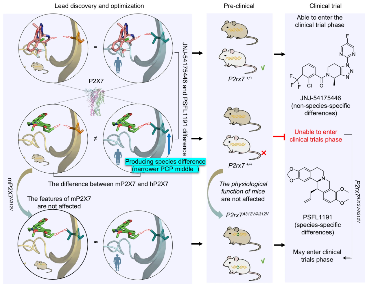 该研究以PSFL1191和JNJ-54175446为探针,从结构与药理层面揭示了P2X7受体种属药效差异的分子机制,并进一步开发了P2rx7A312V/A312V人源化小鼠评价模型,为存在种属差异性P2X7抑制剂的体内有效性和安全性评估提供了新的研究方法。