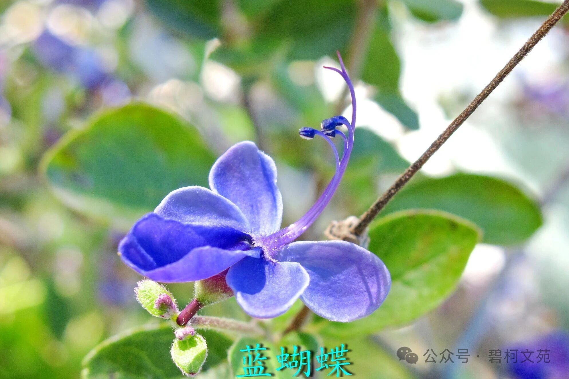 第一次看见心仪已久的珍奇花卉蓝蝴蝶是在里斯本阿茹植物园,开心极了。蓝蝴蝶是马鞭草科的植物,蓝色花,花型酷似一只展翅的蓝色蝴蝶:平摊的花瓣像蝴蝶的翅膀,卷曲的那片花瓣像蝴蝶的腹部,更妙的是卷曲的花丝像极了蝴蝶的触角。由于阿茹植物园就在里斯本,交通方便,我在里斯本工作期间没少去阿茹植物园,拍了不少蓝蝴蝶的照片,发现气温低时,红色素增加,蓝蝴蝶的花会变成蓝紫色的。