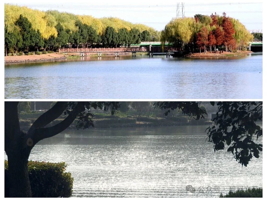 向西北方天际线眺望,可见辰山及其山顶的宝塔,佘山及其山上的天文观察站和天主教堂。环视四周,满目一派既生气勃勃又十分雅静的氛围,一年四季都有美景,是社区老人和周边居民前往健身和休闲的好地方。