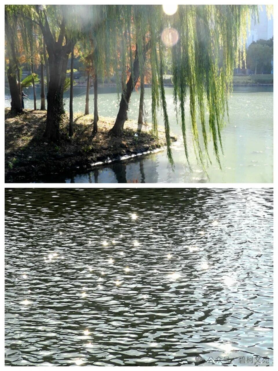 我们所住养老社区四面环水,沿岸铺有步道,步道边垂柳成行,多处设有伸进水面的亲水平台。