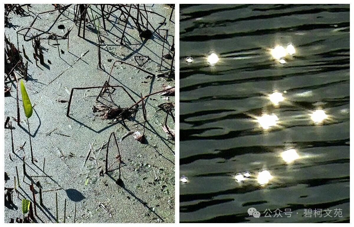 逆光下,微风中的水面波光粼粼,水面上呈现星星点点的闪光,更像是夜空中的星光,使人有种梦幻的感觉。南下的候鸟似乎也会在水面上停留,选择此地为临时的歇脚地,补充食物,恢复体力,再继续前进。
