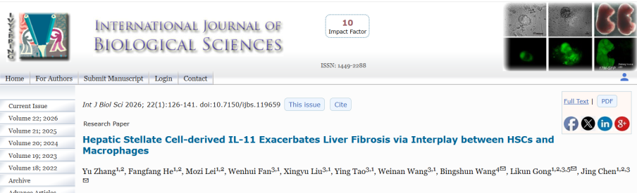 2026年1月1日,中国科学院上海药物研究所宫丽崑团队联合上海交通大学医学院临床医学研究院王炳顺团队,在国际学术期刊International Journal of Biological Sciences上发表了题为“Hepatic Stellate Cells-derived IL-11 Exacerbates Liver Fibrosis via Interplaying between HSCs and Macrophages”的研究论文。该论文主要揭示了肝脏星状细胞(HSCs)分泌的白细胞介素-11(IL-11)在驱动肝纤维化中的关键生物学功能,IL-11通过同时作用于HSCs自身和巨噬细胞,建立了一个自我放大的恶性循环,从而持续加剧疾病进展。