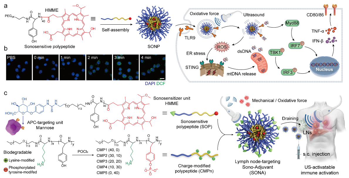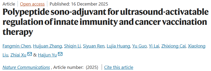 2025年12月16日,于海军课题组在Nature Communications上发表了题为“Polypeptide Sono-Adjuvant for Ultrasound-Activatable Regulation of Innate Immunity and Cancer Vaccination Therapy”的研究论文,该研究创新性地构建了超声激活型聚多肽纳米佐剂平台,其在超声刺激条件下能够时空可控地调节淋巴结内先天免疫反应激活。同时,纳米佐剂平台可普适性高效递送肿瘤特异性新生抗原多肽,并在体内诱导强烈且特异的抗肿瘤T细胞免疫应答。这项研究成果展示了将外源物理刺激转译为精准免疫信号的治疗原型,为后续开发刺激响应型的精准免疫佐剂策略提供重要参考。