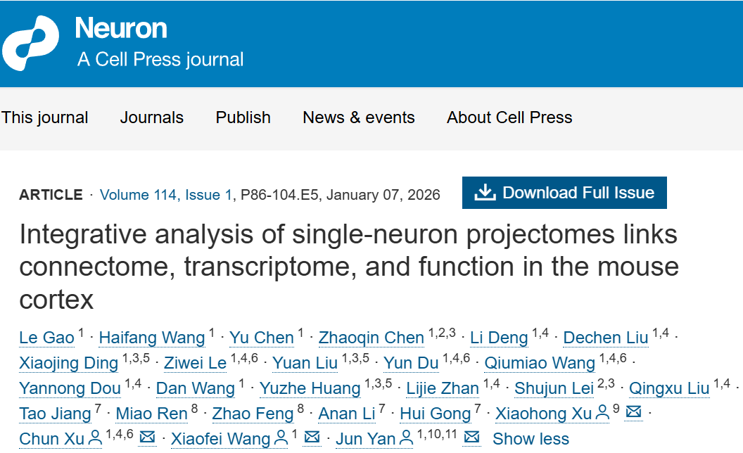 2026年1月7日,Neuron期刊以封面文章的形式发表了中国科学院脑科学与智能技术卓越创新中心(神经科学研究所)严军团队的题为《Integrative analysis of single-neuron projectomes links connectome, transcriptome, and function in the mouse cortex》的研究论文。在本期Neuron杂志中,严军团队绘制了覆盖小鼠全皮层区域的单神经元轴突投射图谱,揭示了大脑连接组、转录组与功能之间的内在关联。