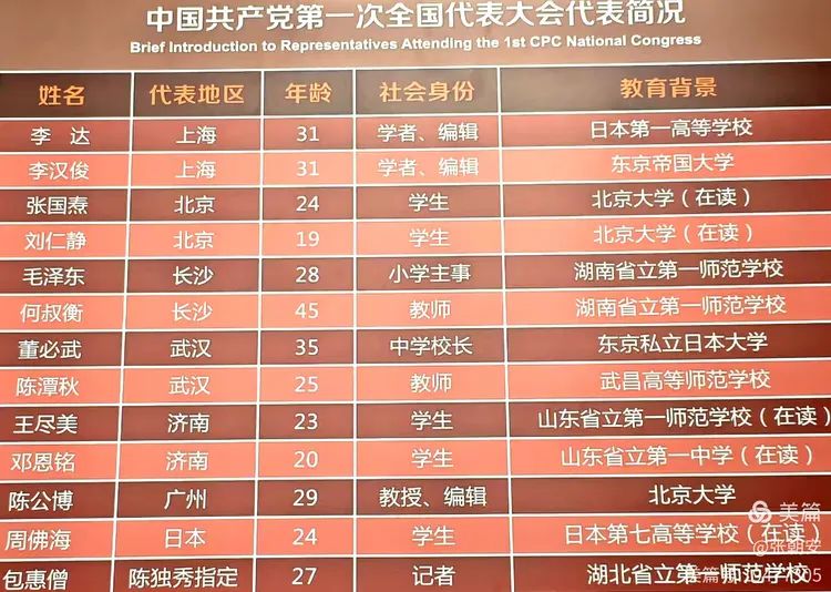 13位一大代表中岁数最大是45岁的何叔衡,最小是北京代表19岁的刘仁静,平均年龄28岁,毛泽东正好是28岁。中国共产党的两大创始人陈独秀和李大钊都因事务繁忙没有参加会议。从一大纪念馆的介绍可以知道,13位代表的不同命运,折射出中国共产党的成长道路何其艰难险阻。13位代表牺牲了4位,脱党7位,解放后登上天安门的只有毛泽东和董必武,令人感慨万千。
