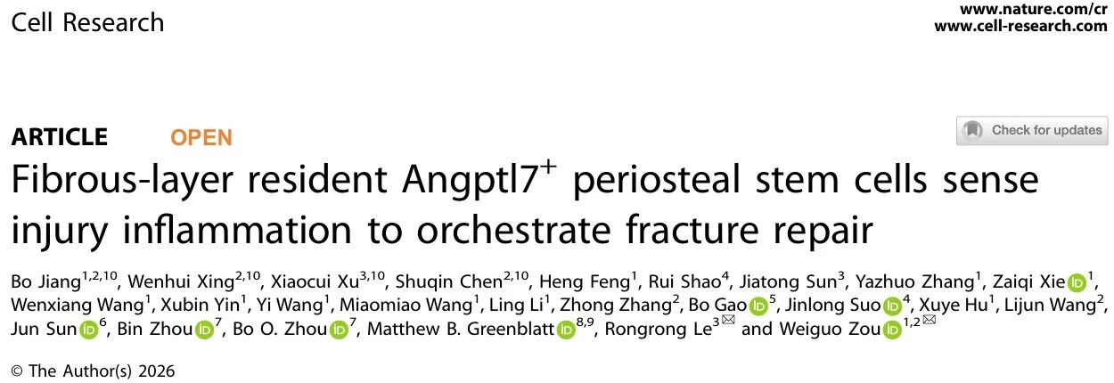 1月8日,国际学术期刊Cell Research在线发表了中国科学院分子细胞科学卓越创新中心(生物化学与细胞生物学研究所)核糖核酸功能与应用全国重点实验室邹卫国研究组与同济大学乐融融教授团队的合作研究成果:“Fibrous-layer resident Angptl7+ periosteal stem cells sense injury inflammation to orchestrate fracture repair”。该研究发现在骨外膜纤维层中驻留着一群特异性表达Angptl7的骨骼干细胞亚群。这群细胞在出生后的骨骼发育及稳态维持中几乎不发挥直接成骨作用,但在响应骨折损伤后迅速激活,通过软骨内成骨途径成为骨折修复的主力军。