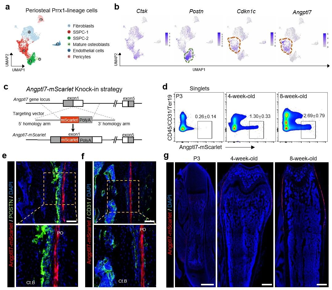 针对这一科学问题,研究人员首先借助单细胞转录组测序技术揭示了骨外膜骨骼干/祖细胞的异质性,发现其存在着两个不同亚群。其中一群特异性高表达Angptl7和Cdkn1c,而另一群则高表达Postn。通过对这两群细胞的差异基因富集分析,发现Angptl7+细胞更高表达干细胞维持相关基因,而Postn+细胞更高表达成骨分化、骨形成相关基因。因此,研究人员推测Postn+细胞是负责稳态骨维持的细胞类群,而Angptl7+细胞的功能及命运则引起了他们极大的兴趣。为了检测Angptl7+细胞在骨骼上的分布,研究人员构建了Angptl7-mScarlet实时荧光报告小鼠,发现Angptl7+细胞特异性定位于骨外膜纤维层,并不存在于皮质骨、骨小梁、骨髓、生长板等其他骨骼部位。