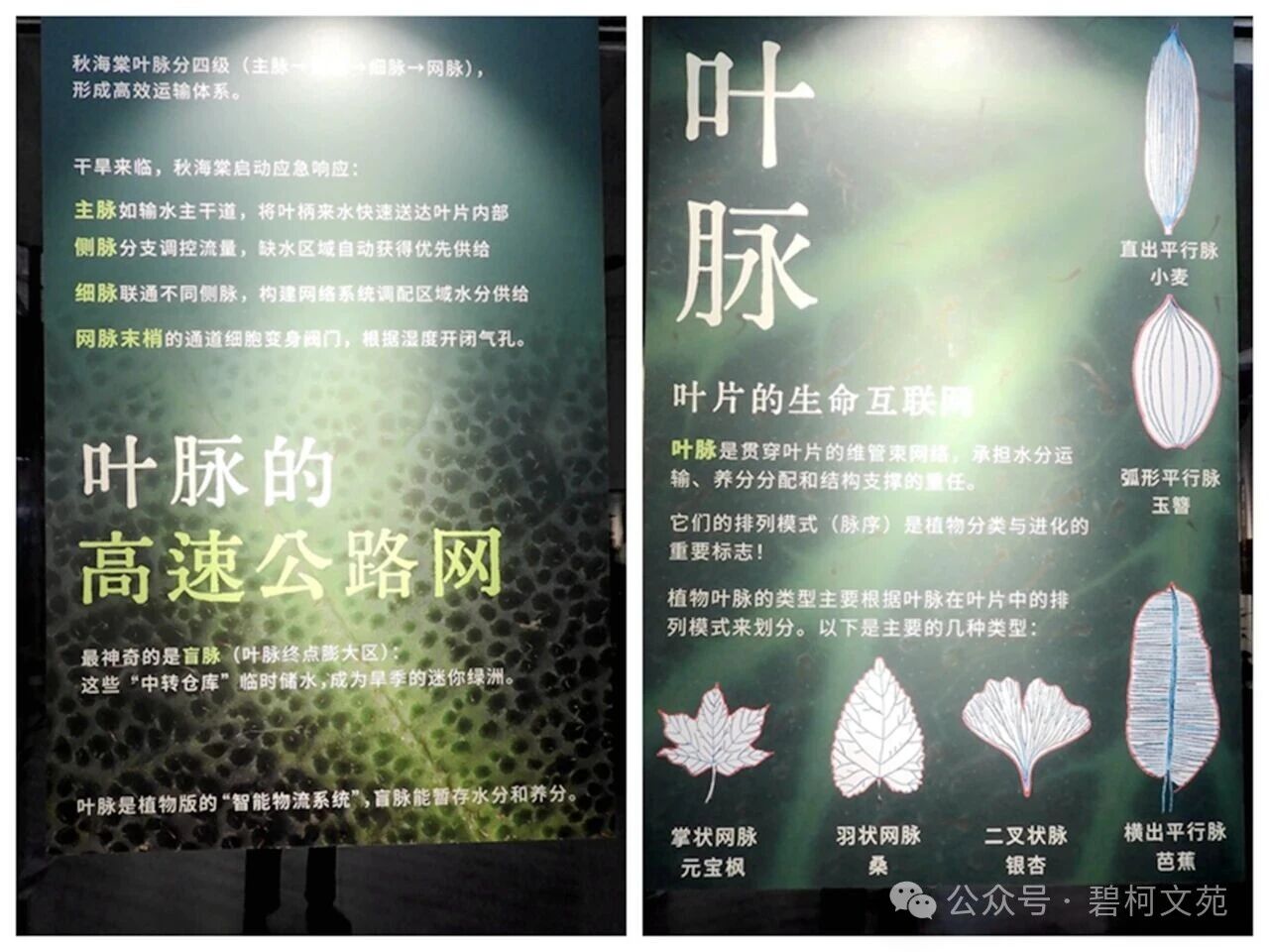 在展厅墙壁上,还有一幅又一幅亮眼的秋海棠整体或局部的图片或科普诠释(图1),其中“叶脉的高速公路网”和“叶脉叶片生命的互联网”点出了叶脉的关键功能(图2)。12幅叶脉图片构成了一大版面,展示出叶脉的基本形态和走向(图3)。