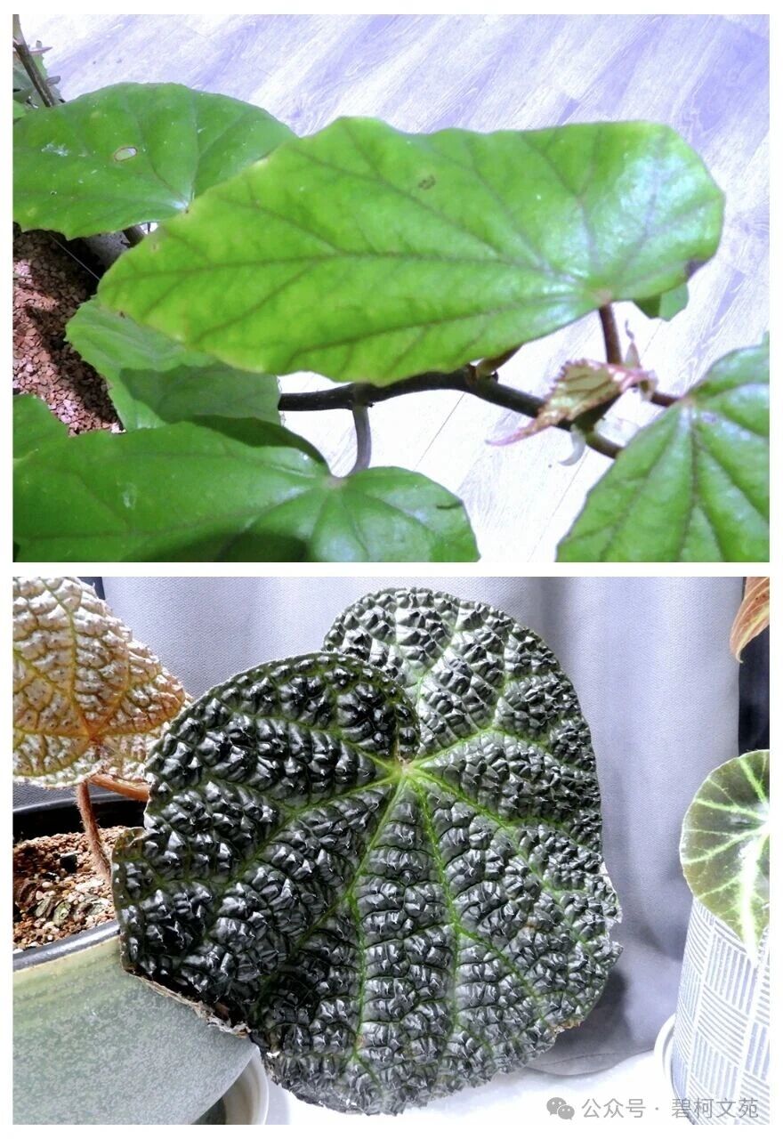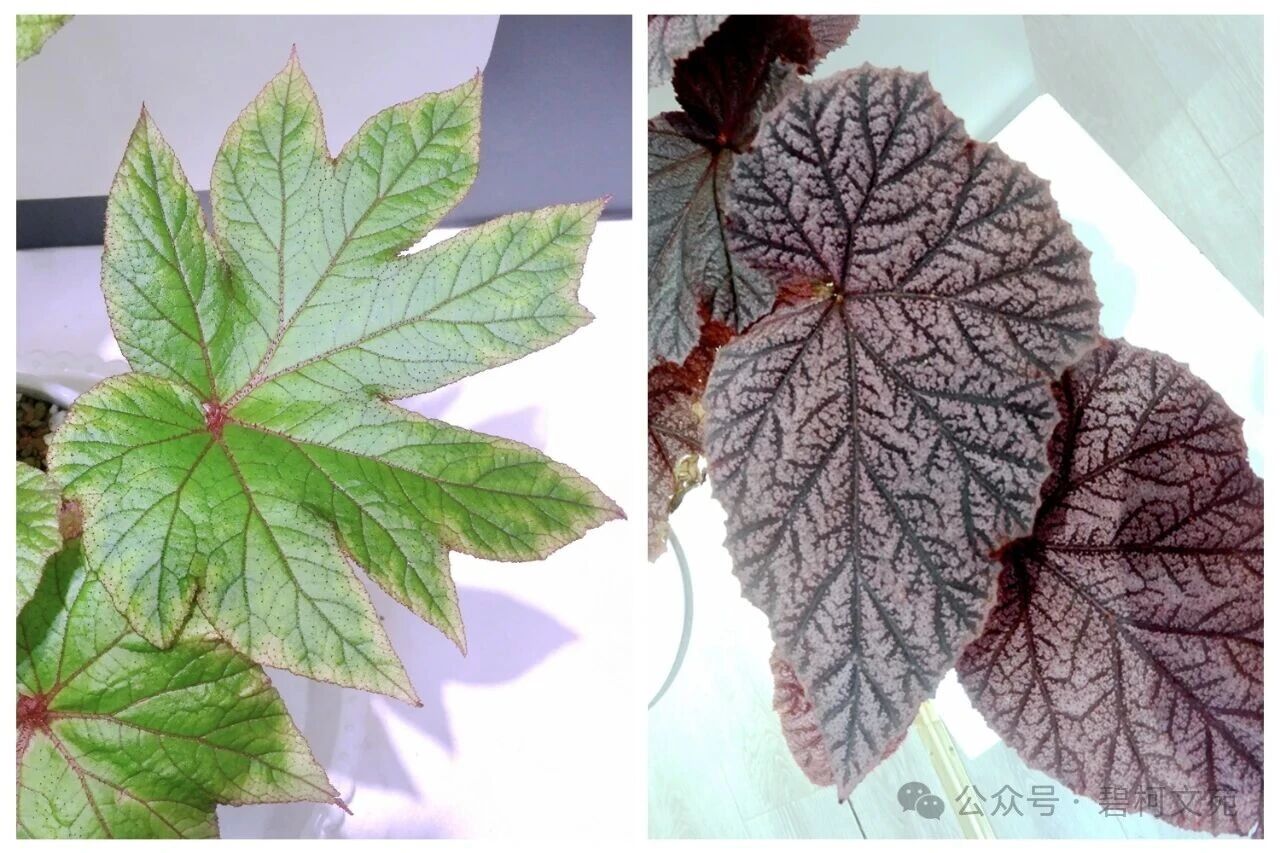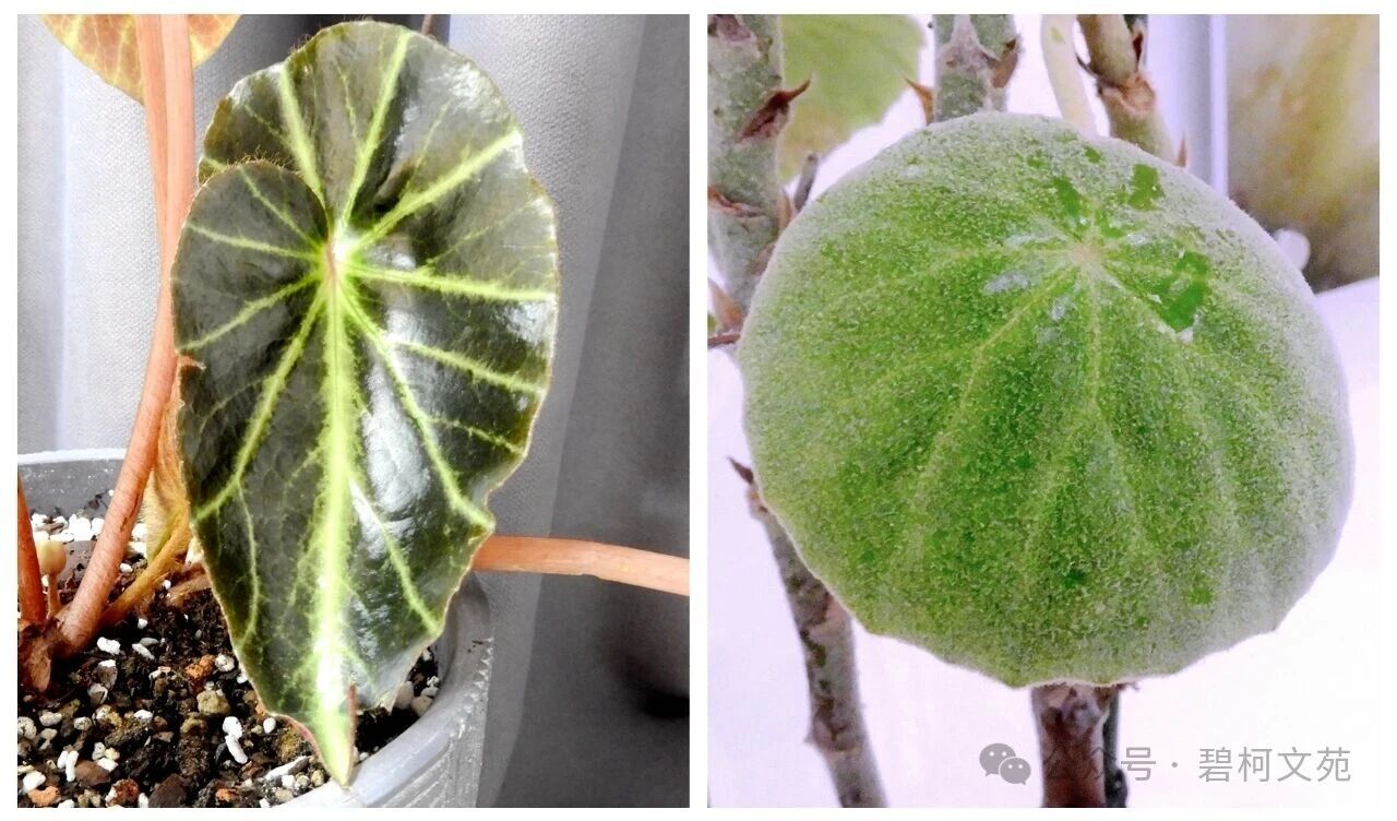 秋海棠有数以千计的物种,呈现出千奇百怪的叶片,其结构、形态、纹路和色调的反差之大,难以言表。叶形有盾形也有圆形(图4),纹路有粗也有细(图5),斑点有大也有小(图6),叶面有光面也有皱面(图7),毛刺有粗大也有细小(图8),叶裂有浅也有深(图9)。但是,万变不离其宗,进化至今,叶片都拥有粗细、方向各异的叶脉(图10~11),构成了叶片的“高速路”和“互联网”。