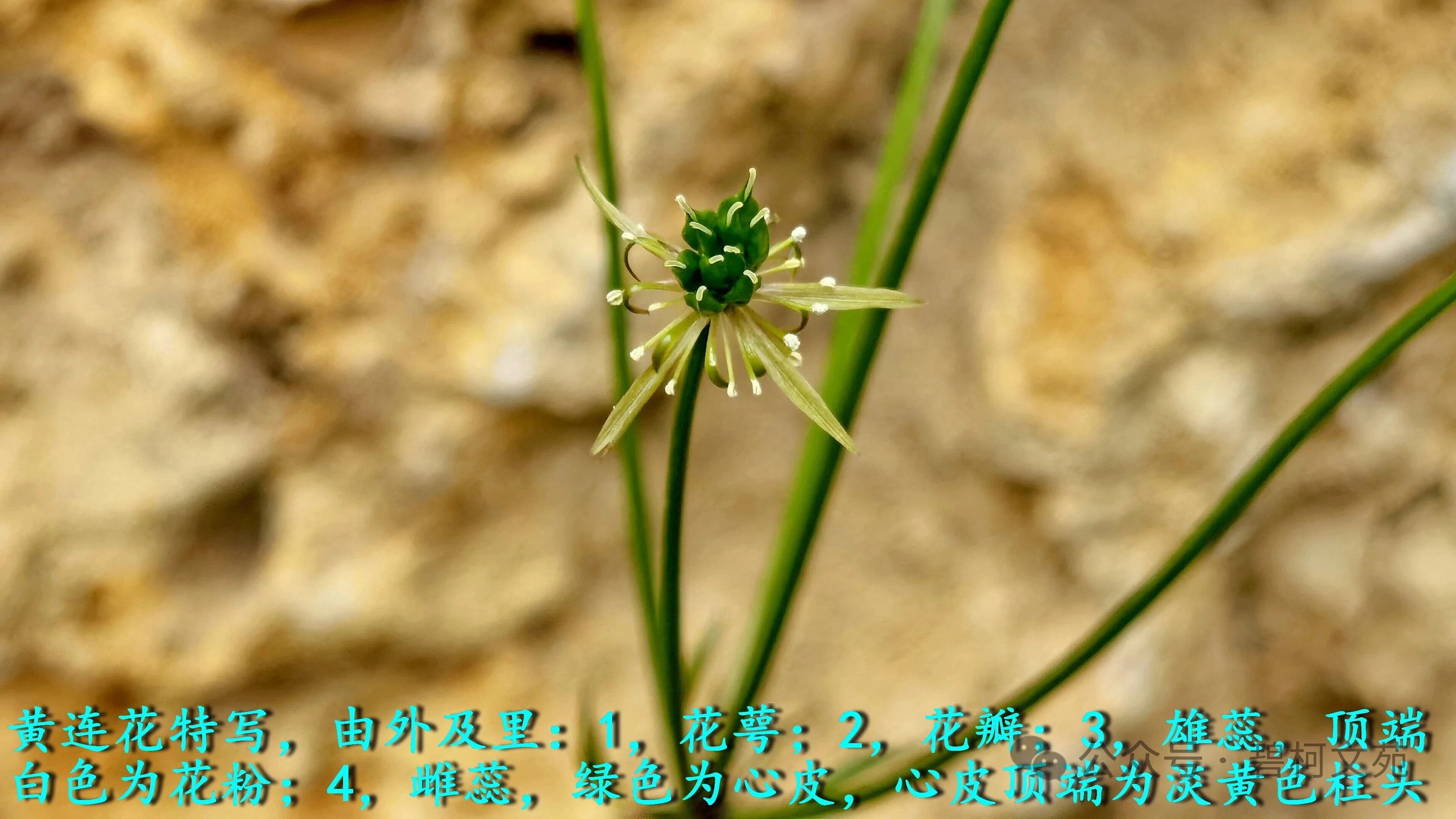 黄连开花时先抽出一根高挑、顶端是多歧聚伞花序的花葶。花序上的小花朵虽然不显眼,但层次分明:最外层披针形的细长条是花萼片;第二层是花瓣,比花萼片短,因此很好辨认。据网络资料介绍,花瓣上有凹槽形状的蜜腺;第三层是雄蕊,药囊淡黄色,花粉是白色的。最中间是雌蕊,由绿色的心皮和心皮顶端的浅黄色柱头组成。授粉后,心皮发育成蓇葖果。