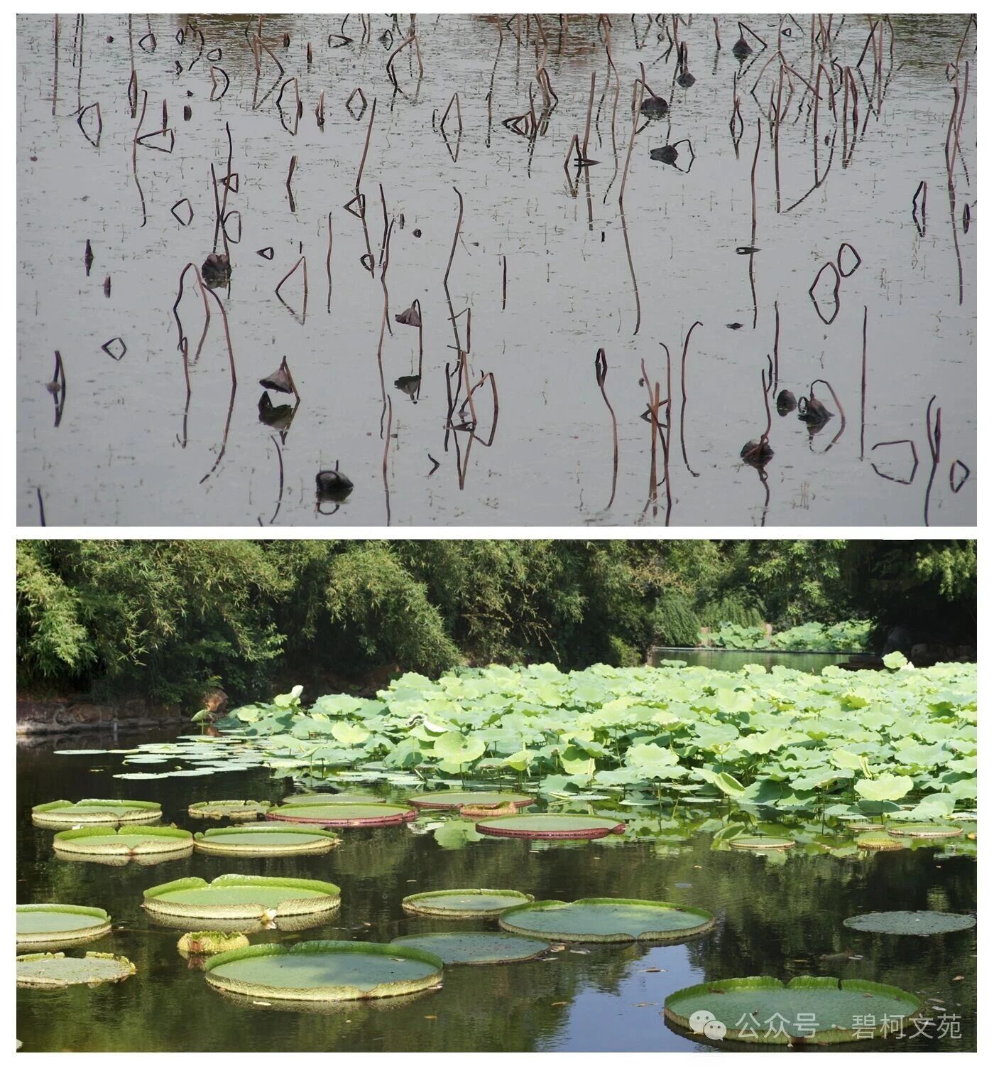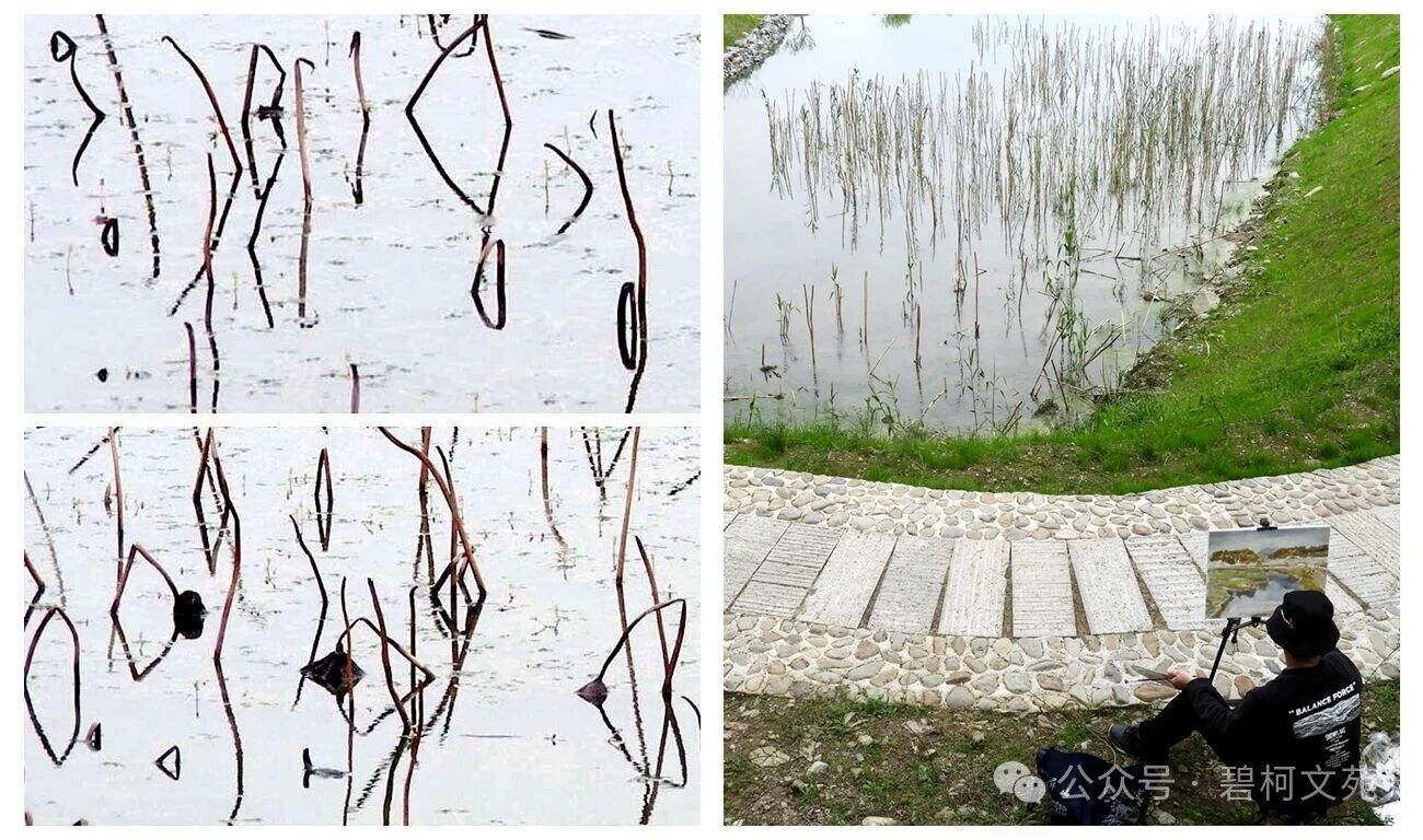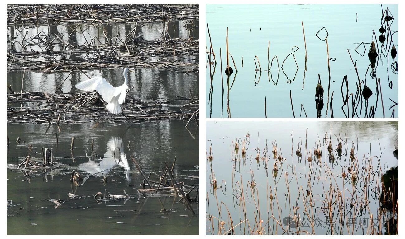 冬季,严寒之中,一支支荷叶枯柄似铁骨、似银勾,在荷塘的水面之上,连同它们的水中倒影,勾画出许许多多奇妙的几何图形,任凭人们挥洒想象,冬日的荷塘又成了美术生取景写生的胜地。真可谓“冬寂铁骨摩天起 铁线银勾象形文”。