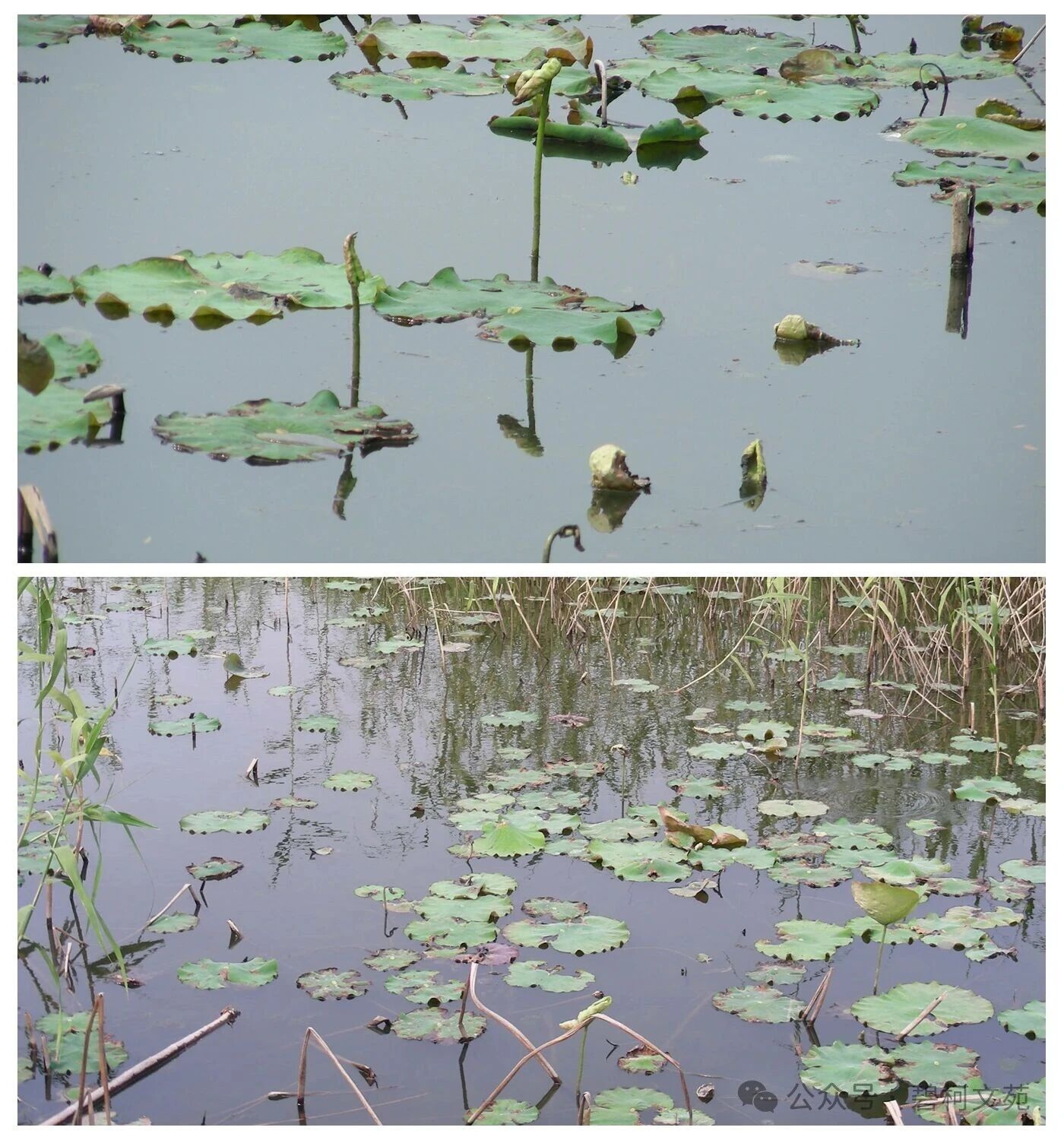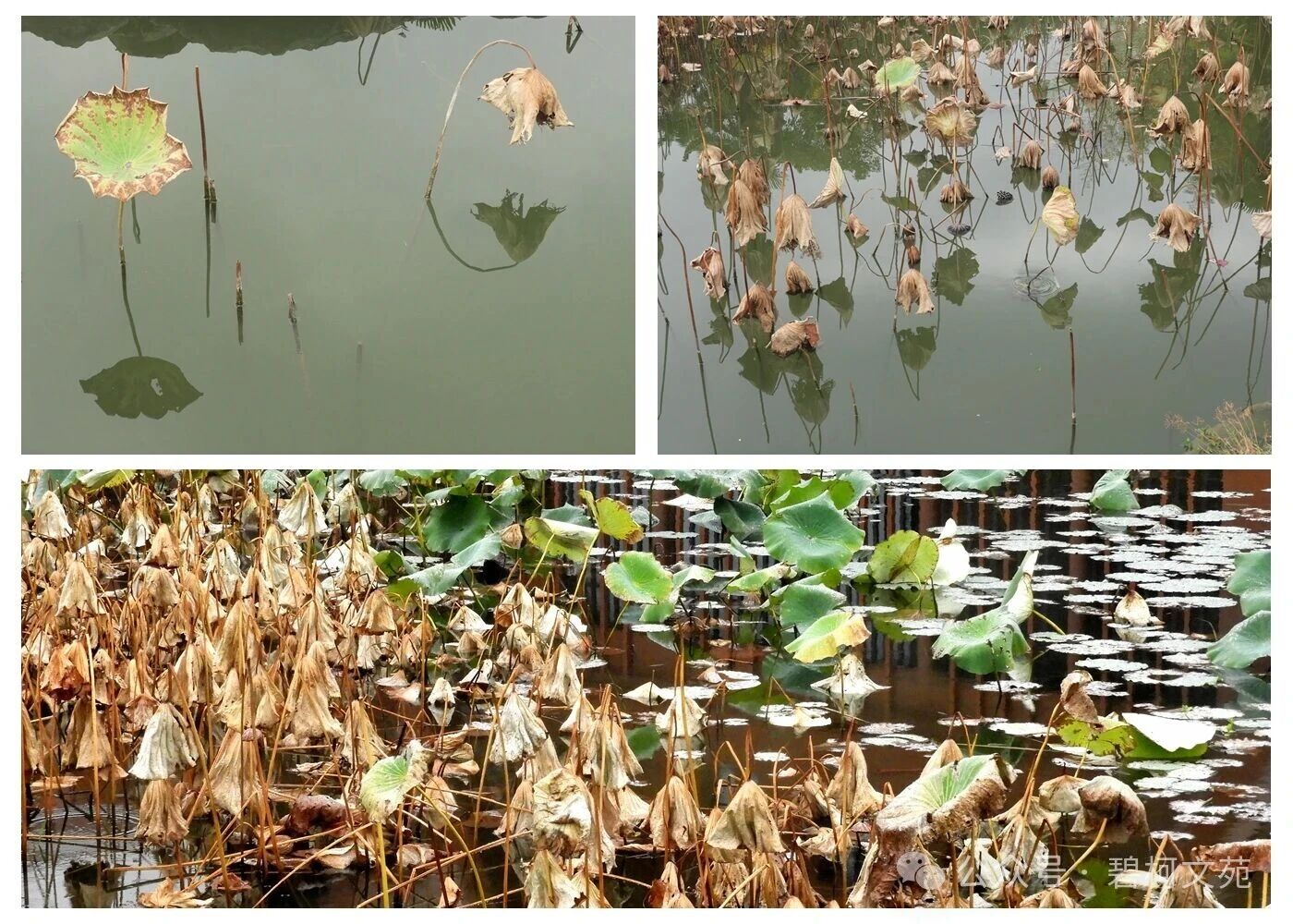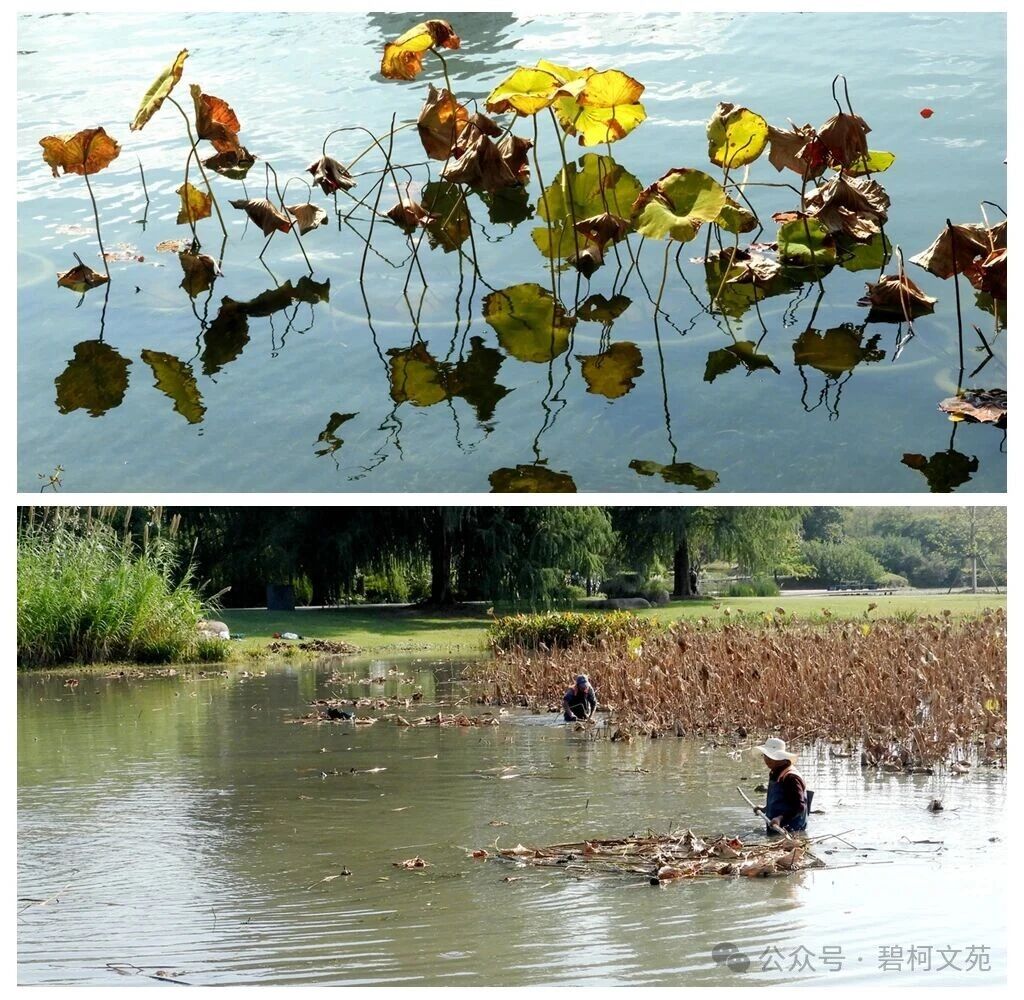 秋季,气温时而骤然下降,在荷塘各处看到的是荷花的残枝败叶。但是,这却是一年一度的收获季节,荷塘出现了另一副景象,农民们穿着防水衣裤,站在齐腰深的水中忙着起获莲藕,脸上露出丰收的喜悦。可谓“秋残枯笠敲棋局 起藕场景一片忙”。