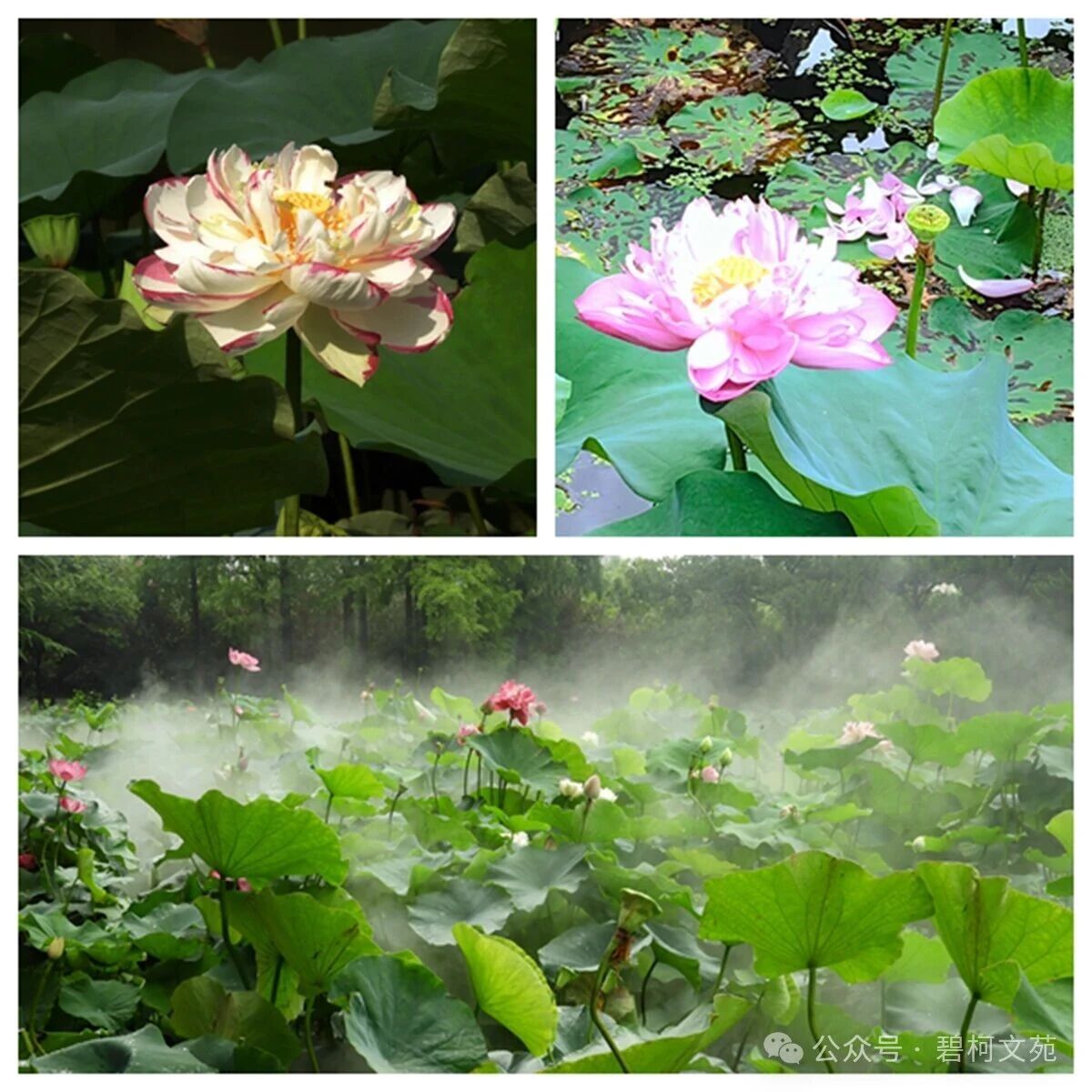 夏季,酷暑之中,水面之上,白色、红色和杂色的各形荷花或显露,或半掩在翠绿的荷叶之中格外醒目。荷花凋谢后,散落在绿色荷叶上的各色花瓣又成一景,色彩交融,别有意境。可谓“夏盛荷花齐绽放,胭脂雨泼景中景”。