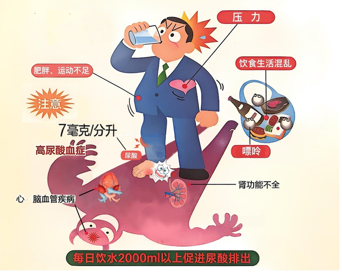 多喝水对促进尿酸排泄有帮助,建议每日饮水量维持在2L以上,可以饮用水、茶,应避免饮用含果糖饮料或含糖软饮料和浓汤。保证每日尿量在2000ml左右,尿量多了,与之相应的尿酸排泄才会增多,对尿路结石起到了预防作用。