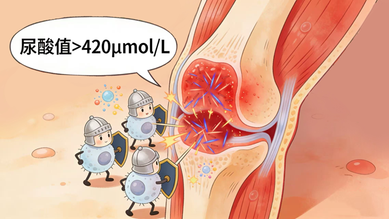 因为白细胞有识别并清除异物的作用,当发现关节中的单钠尿酸盐结晶后,白细胞将关节部位沉积的单钠尿酸盐结晶判断为“外敌”,白细胞就不断聚集并对“外敌”展开攻击,竭力吞噬。白细胞一边释放各种化学物质一边和尿酸盐结晶战斗,通过自己的消化酶来溶解结晶。而一般认为关节炎症正是由于在战斗过程中释放的各种酶、活性氧和前列腺素等引起。由于这些物质引起毛细血管扩张,血流量增大,引起红肿,进而产生疼痛,这就是痛风性关节炎形成的原因。