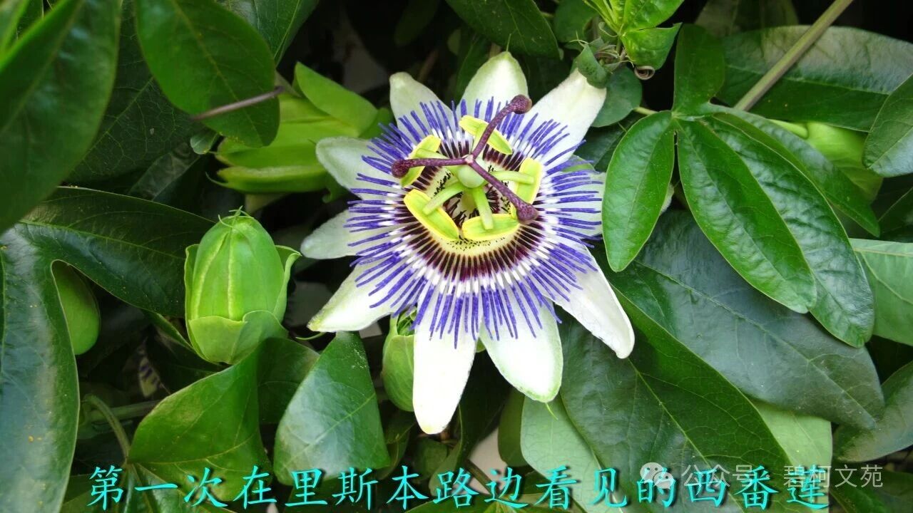 我第一次看见西番莲是在葡萄牙首都里斯本的路边。那是2011年4月25日,是葡萄牙纪念“康乃馨革命”的日子。是日,葡萄牙总理府和议会对外开放,欢迎参观。总理府和议会离我住处很近,吃过午饭我就去了。参观结束,走出总理府准备回家,突然发现总理府对面的山墙上有几朵蓝色的花,近前一看,竟然是我仰慕已久的西番莲花!以前只在餐桌上见过西番莲的干果(葡萄牙人称之为“爱情果”“热情果”),这下看到鲜活的花了,花朵的美丽超出了我的预期!