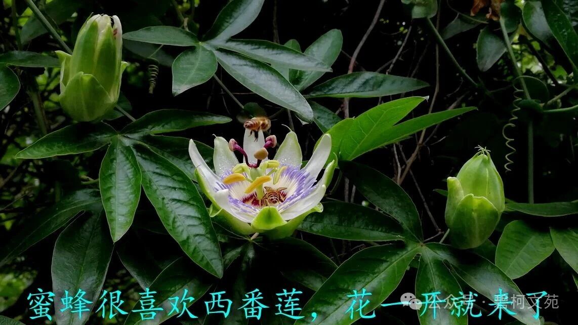 到了2021年6月,这株西番莲又开花了,那年的着花量很大,花藤上基本是一叶一花!花不香,但前来采蜜的蜜蜂非常多,往往好几只蜜蜂同时拜访一朵花。这株西番莲也是蓝色系,是目前唯一可以在上海露天过冬的品种“紫冠”。通过观察摸到了花朵绽放的规律:从中午开始绽放,一直开到晚上也不凋谢。我家小区离这里才700多步,所以开花那几天,我中午拍,下午拍,吃过晚饭散步过来拍,可谓拍得不亦乐乎!