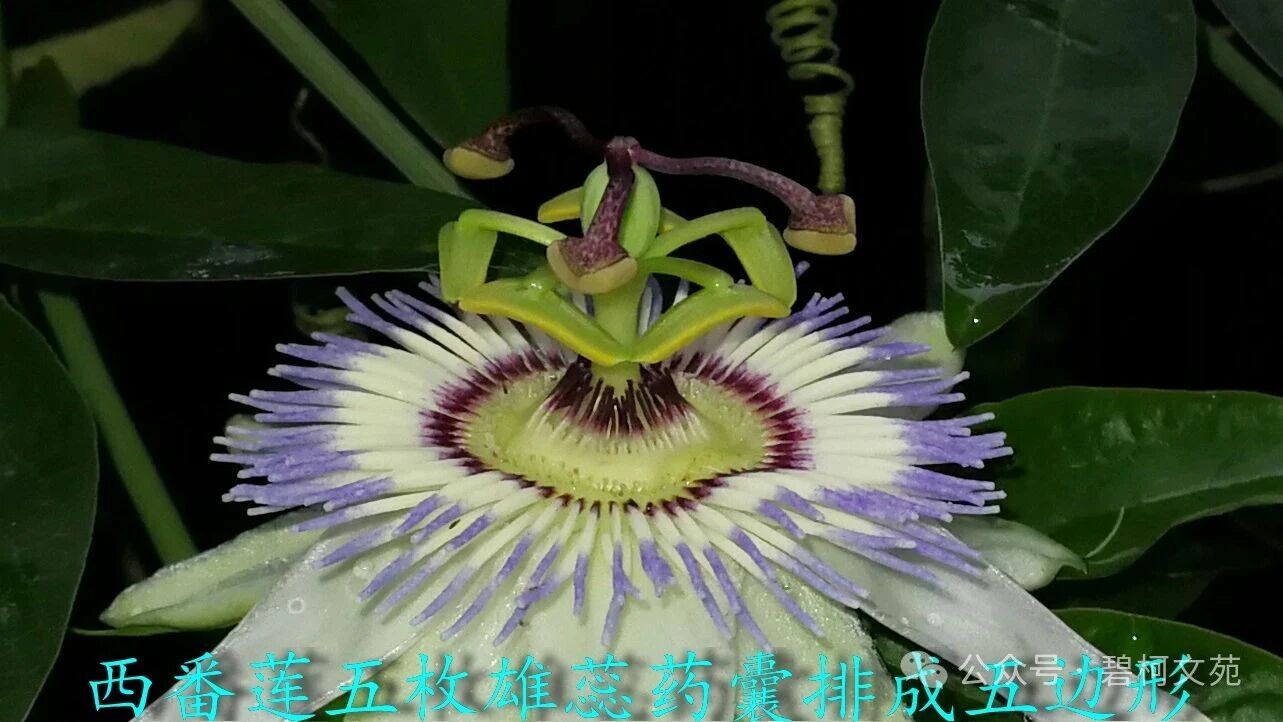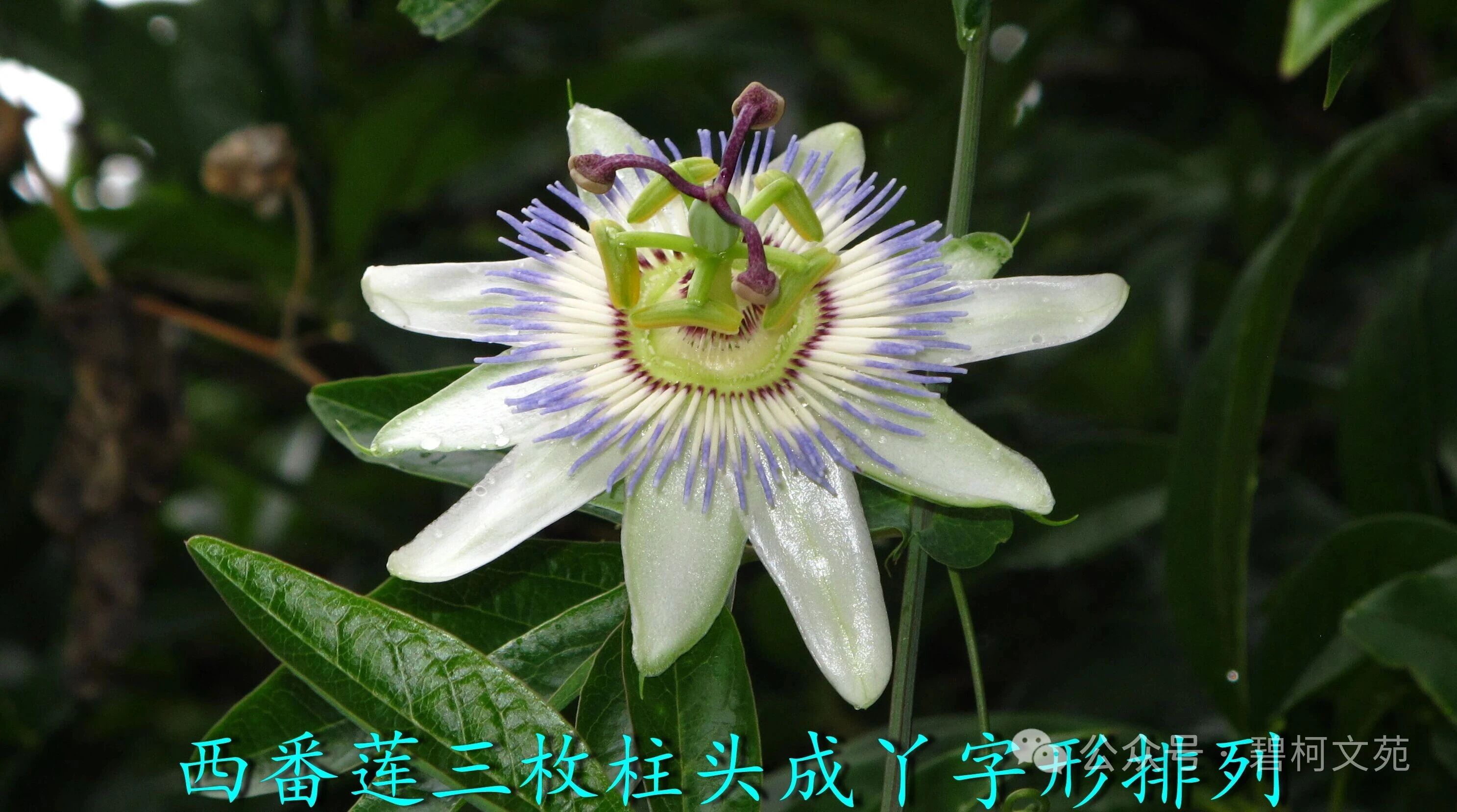 西番莲是著名的珍奇花卉西番莲,花型奇特。从花基部数起,依次为绿色的花萼,白色的花瓣(不同品种颜色不一样),蓝色花丝形成的两轮副花冠,球形子房(未来的果实),黄色的雄蕊药囊(刚开时药囊黄色部分朝天,全开后反转朝地),“丫”形的棕褐色柱头(刚开时三枚柱头呈竖起状,全开后躺平),这些花器官分布有序,错落有致,相互之间还分得很开。一眼看上去,觉得花朵立体感很强,如同一个小花篮,造型很美。我在葡总理府外看见的西番莲,其副花冠是蓝色的,属于蓝色系。