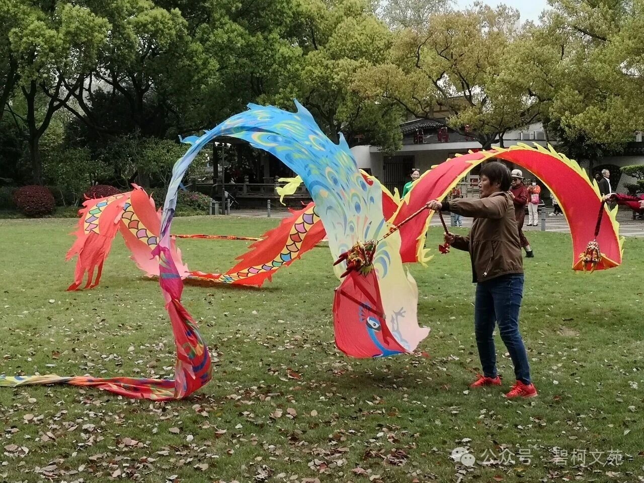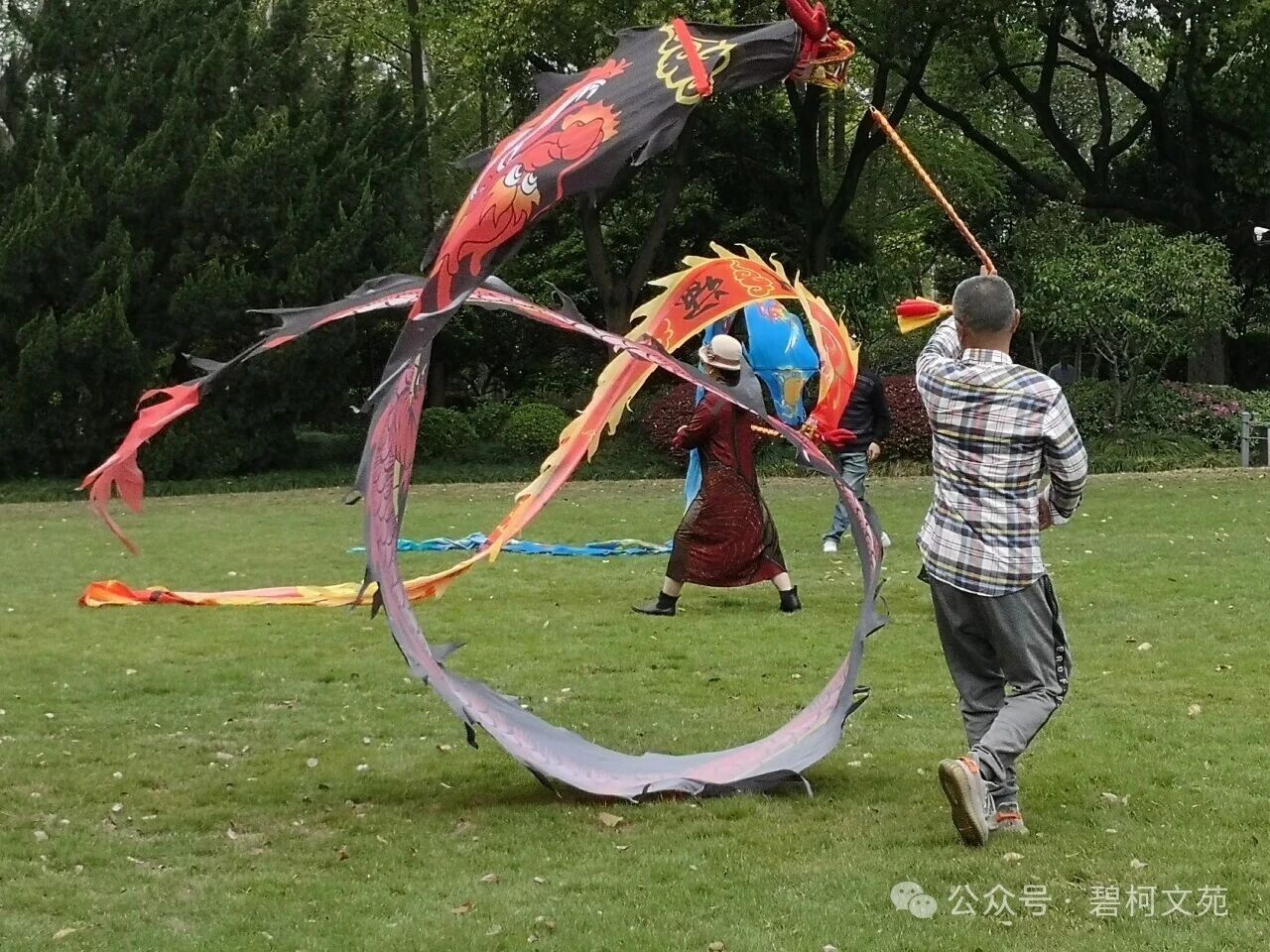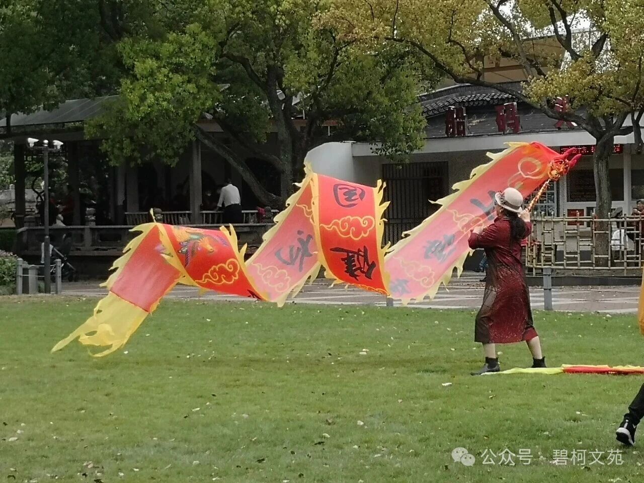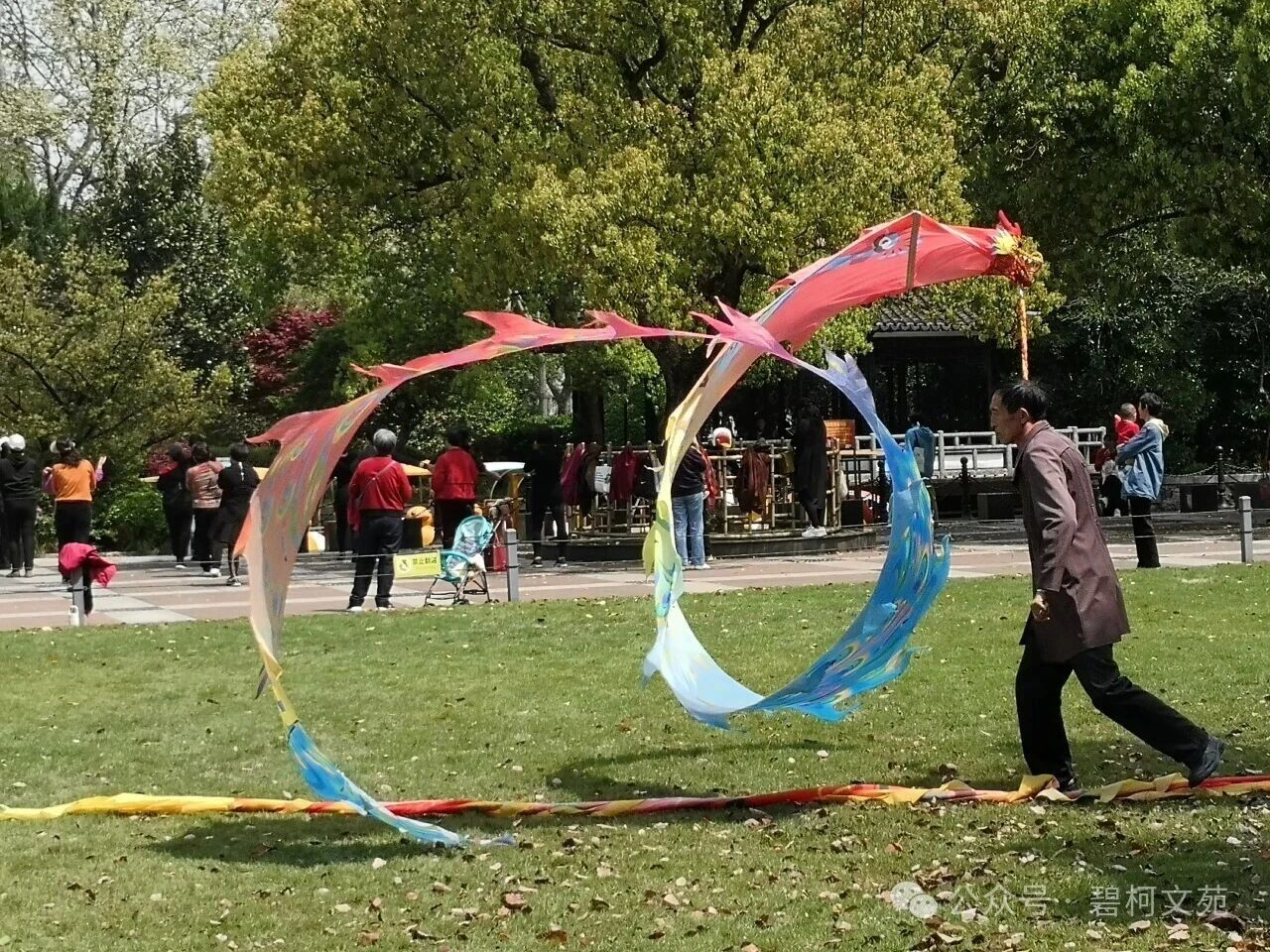 即兴表演最是热闹。扎羊角辫的小女孩追着龙尾跑,张师傅让龙身围成圈,龙头轻点她的发顶。杭州来的母亲举着相机连拍,镜头里女儿的笑容十分灿烂。中午时分,龙身被小心地折成数段。张师傅他们坐在校长树下整理装备,李大姐翻着朋友圈里的九宫格,小王则在直播尾声挥着手说“明天见”。