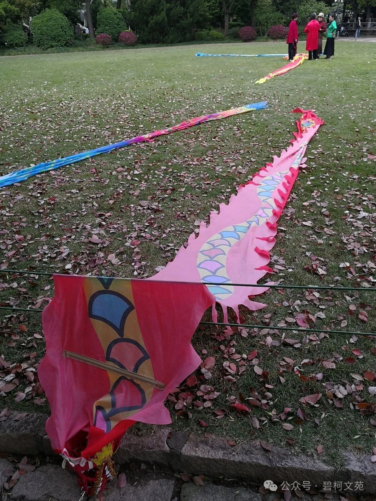 清晨的康健园还浸在薄雾里,香樟林畔的草坪上已响起密集的鼓点。三五个身影裹着亮片红绸立在晨光中,领舞的张师傅正将鎏金头饰扣在龙头上——这便是他们的“装备库”,除了20米长的龙身,还有绣着云纹的腰鼓、缀着铃铛的指挥旗,往草坪上一铺,像铺开片流动的霞光。