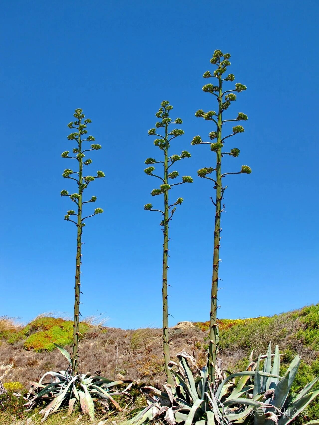 2010年春节后,我被派往葡萄牙工作。也是一个周末,我和家人驾车从里斯本前往罗卡角游玩。这是一条风景优美的海岸公路,左边是浪花,右边是山花。走着走着,突然发现路边矗立着许多“竹竿”,是不是以前在植物园看过的龙舌兰啊?于是停车观赏,还真是龙舌兰!
