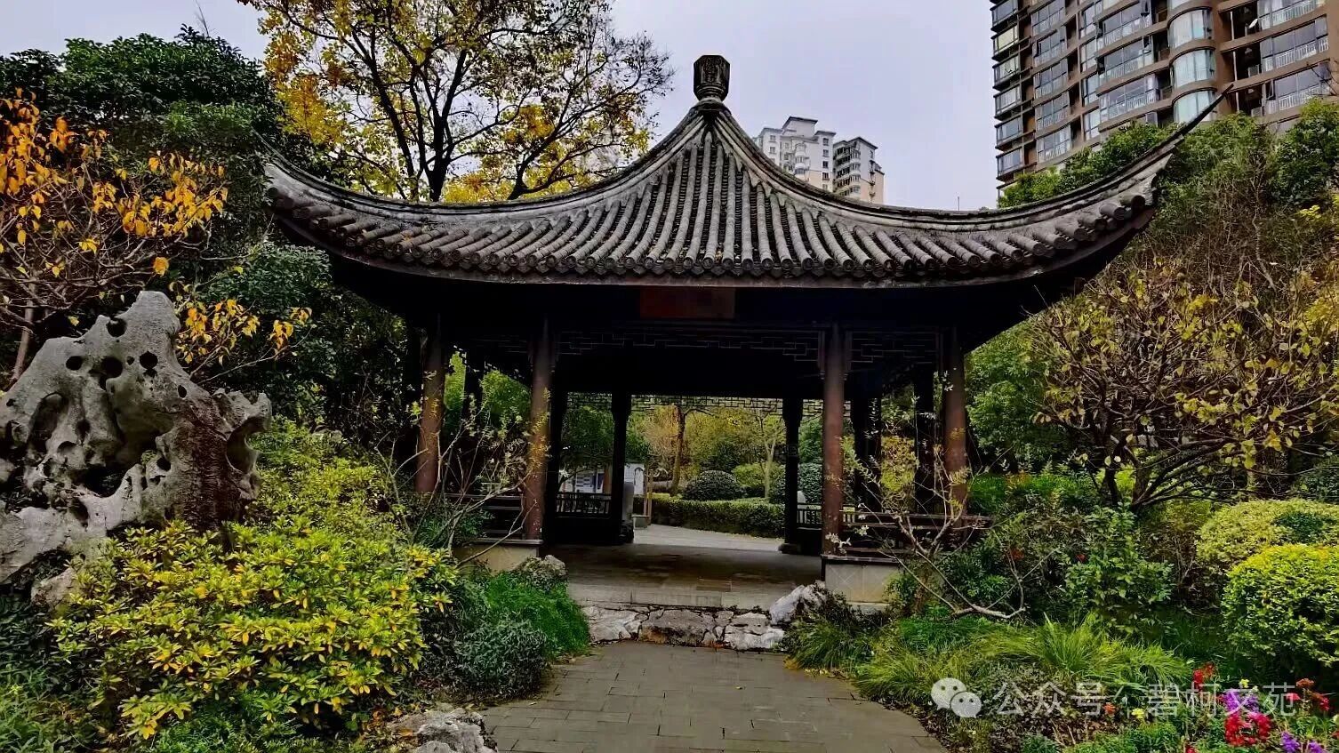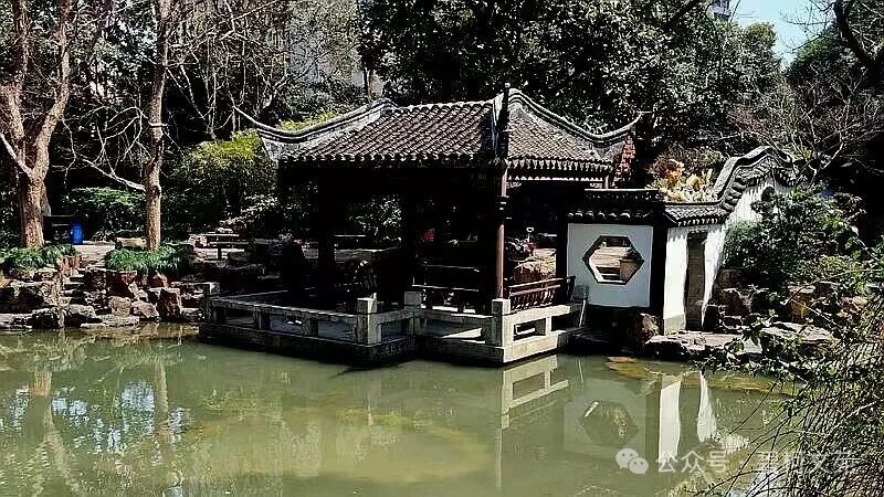西南角的大假山高8米,由两千多吨青石、黄石叠峦造峰,山间迂回曲折的石路相通,登顶可将全园景致尽收眼底,山巅的溪山亭与南麓的鹃亭两两相望,别有情趣。东侧池塘波光粼粼,三曲石板桥横跨水面,岸边柳桃相映,睡莲点缀,临水而建的绿色琉璃瓦水榭,是游人弈棋读书、观赏湖光山色的好去处。