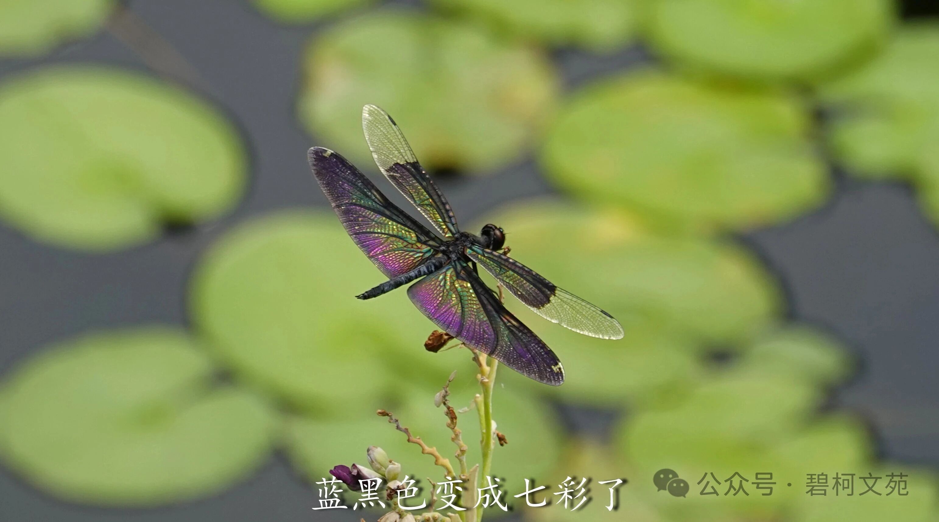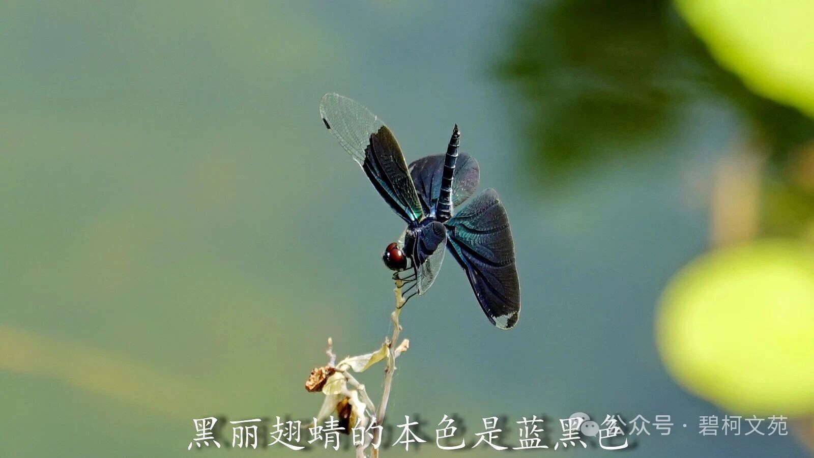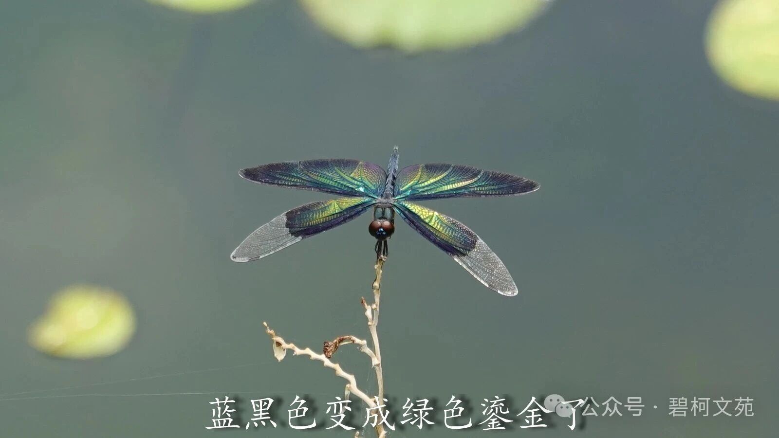 从镜头里看黑丽翅蜻,发现它们在上演川剧的变脸,小翅膀轻轻地晃动一下,或者尾巴竖起来,翅膀的颜色就变了。若不是亲眼所见,难以相信原本是蓝黑色的它们,一会蓝色,一会紫色,又一会是绿色。 这种现象让人想起孔雀和蝴蝶,它们绚丽斑斓的羽毛和翅膀非常抢眼。