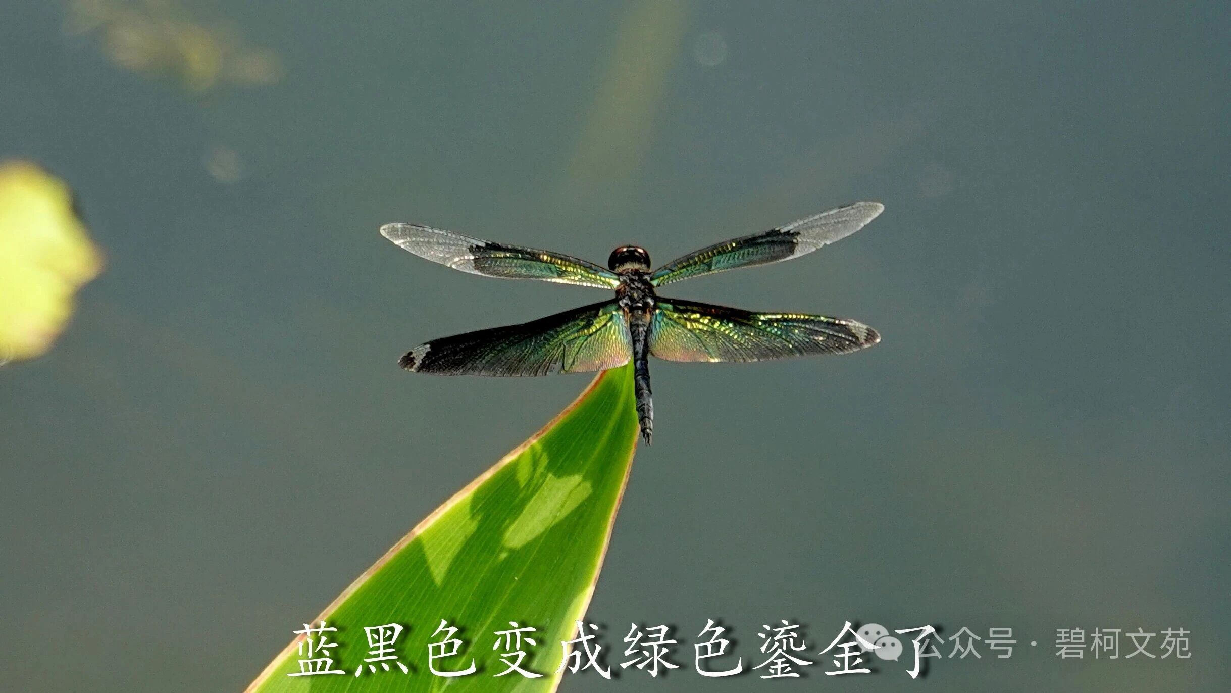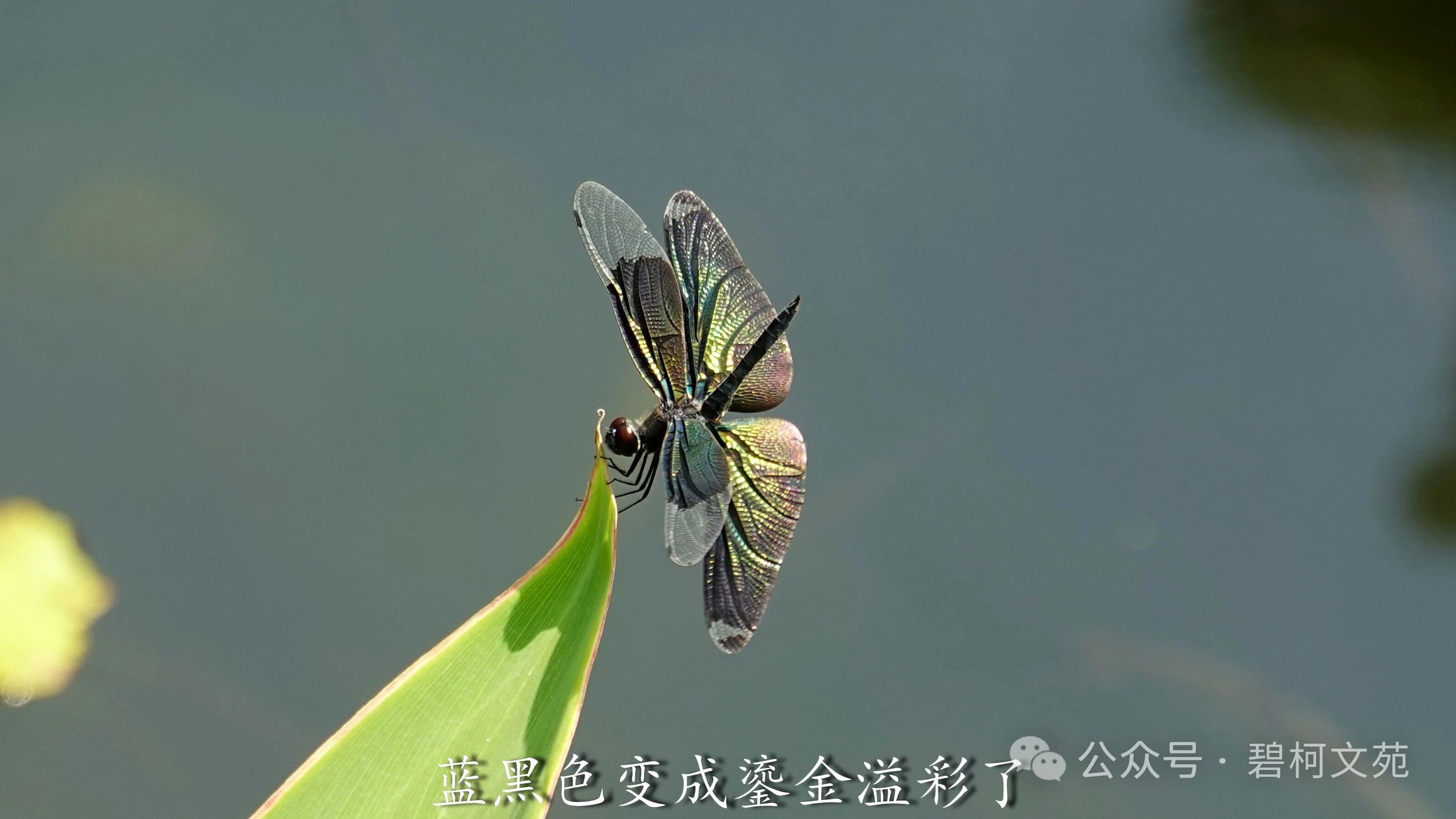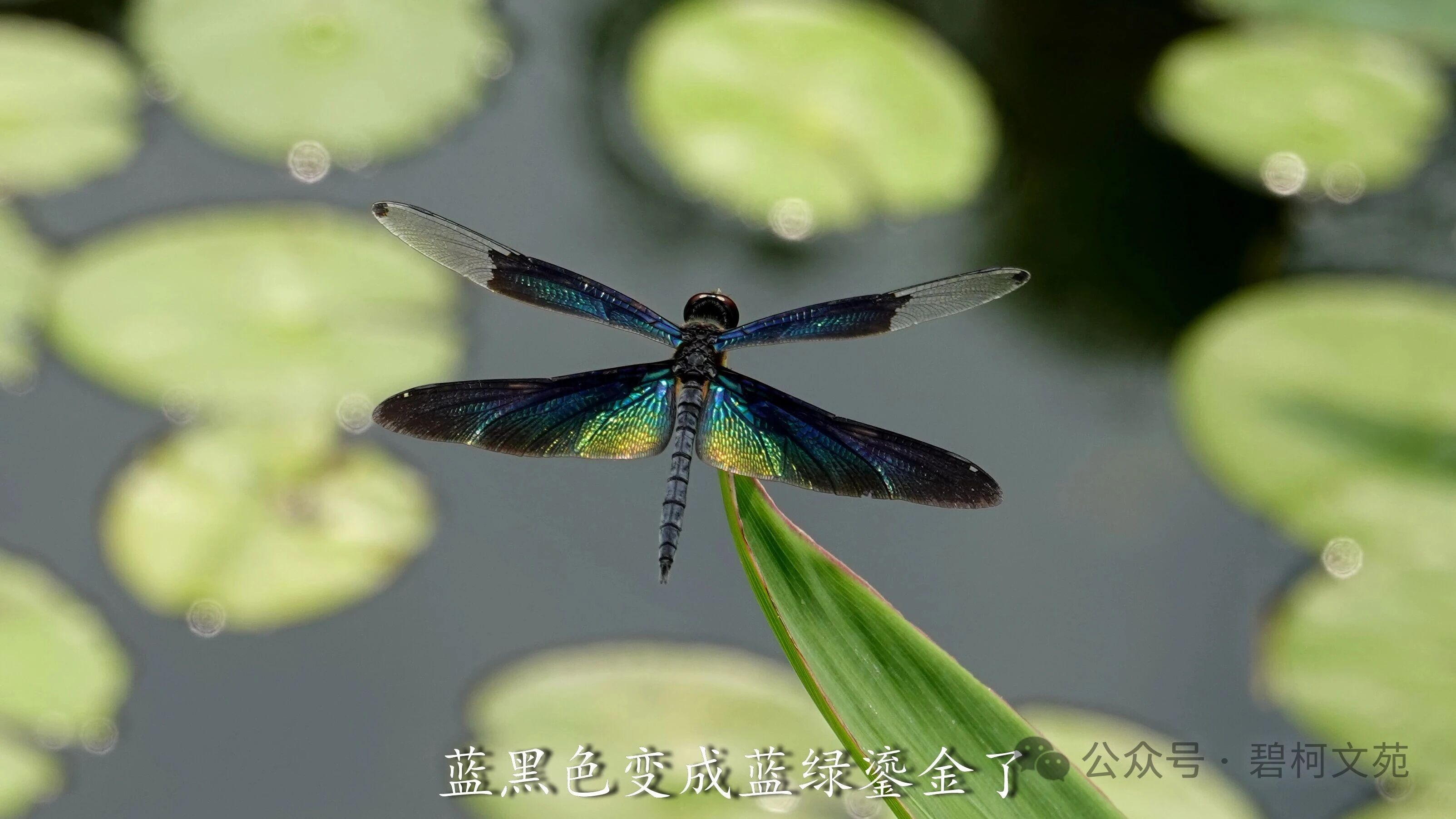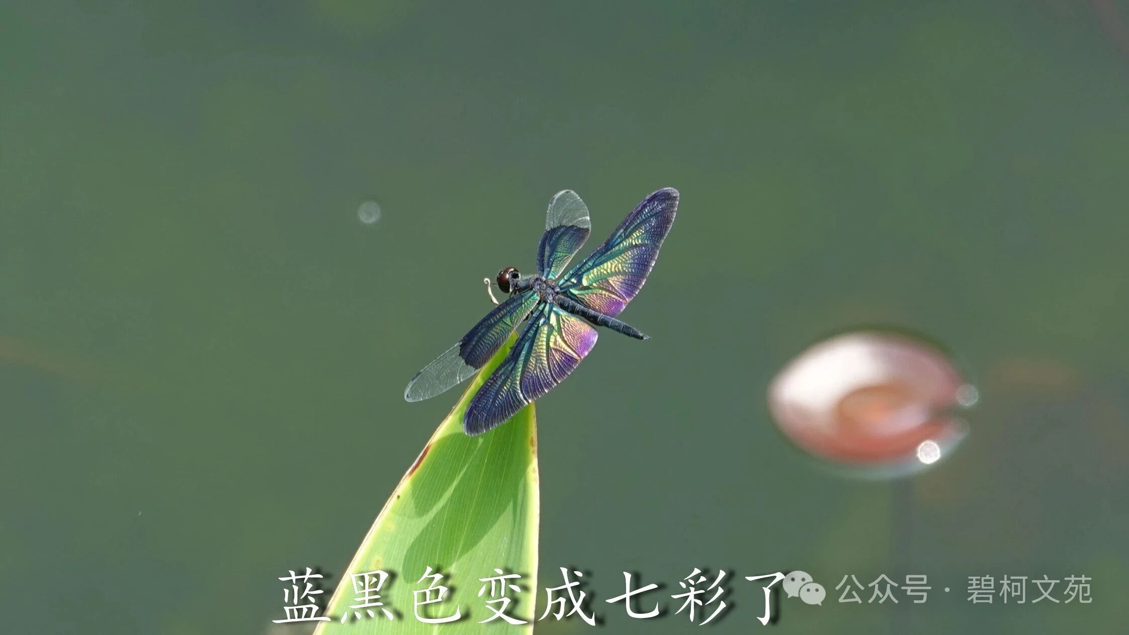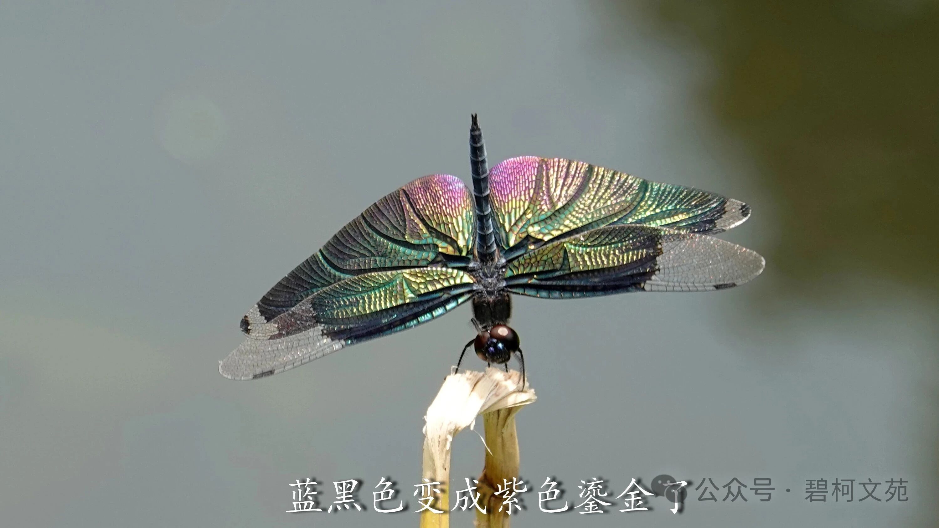 川剧变脸有各色各样的脸谱,小小的黑丽翅蜻也会展示各式各样的颜色,我最喜欢的还是彩虹色。黑丽翅蜻是夏日水域里靓丽的百变小精灵,给许多热爱小动物的退休老人们带来了欢乐。如果您也感兴趣,到了夏天记得去找找它们哦。