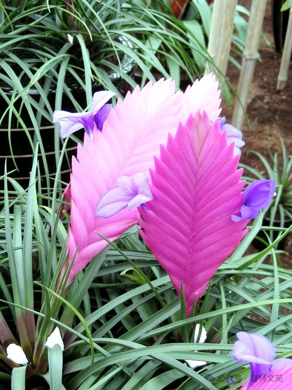 人们也常用生活中的贵重物品或日常用品来命名花。凤梨科的紫花玉扇,朵朵紫花插在精致的玉扇上。兰科的拖鞋兰(又名兜兰),花的下部活脱像一只包头的大拖鞋。