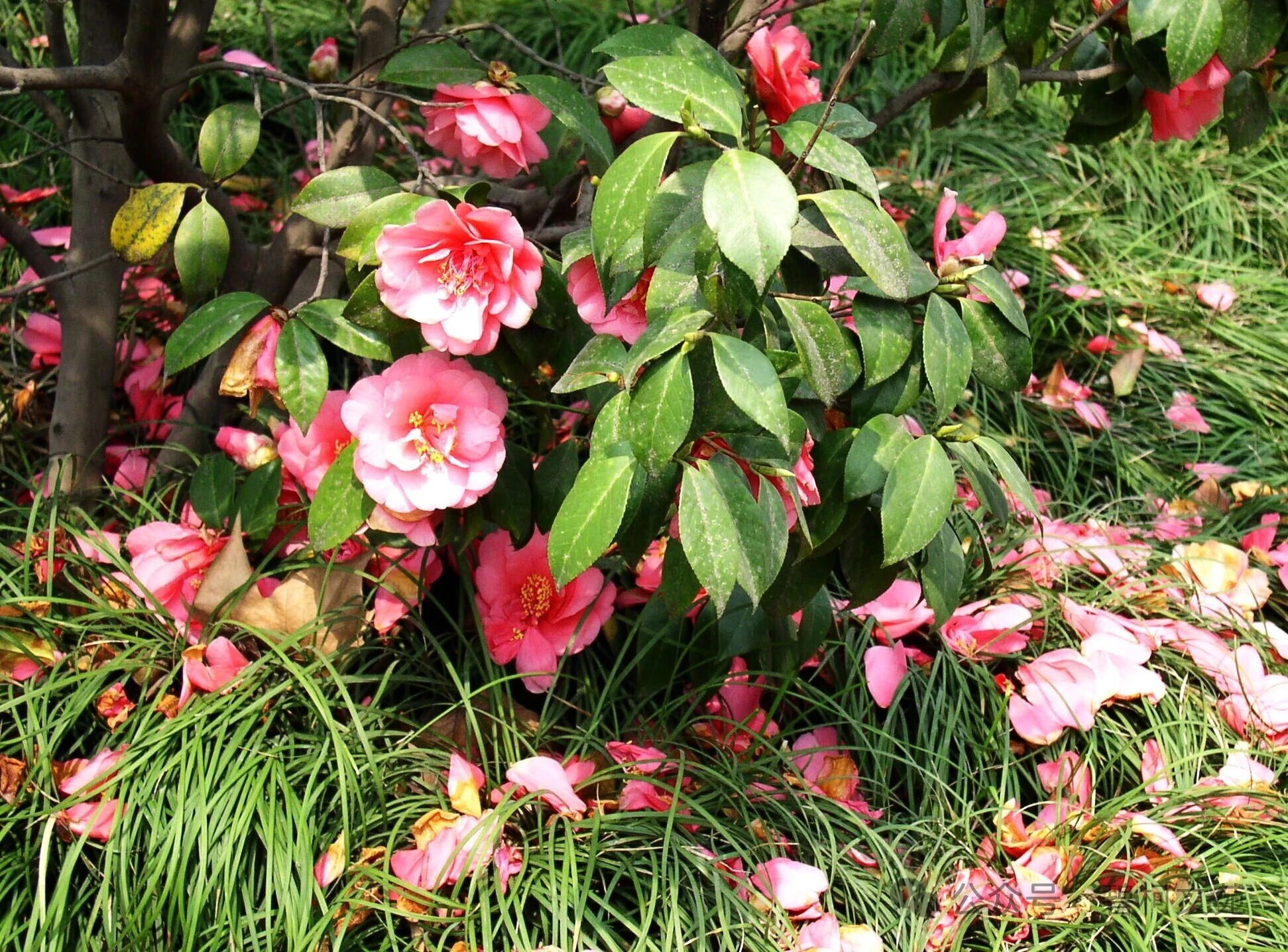 茶花的花期很长,一朵花能开上10天之久,一朵谢了,另一朵又紧接着绽放,从冬至春,从未间断。陆游曾写道“惟有山茶偏耐久,绿丛又放数枝红”,是啊,在风雨交加的日子里,桃李早已凋零殆尽,唯有茶花,在绿丛中执着地绽放。