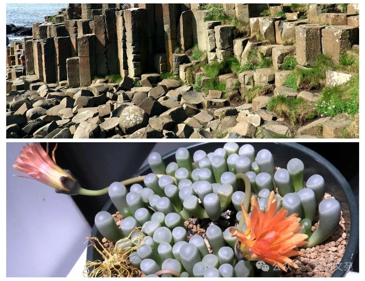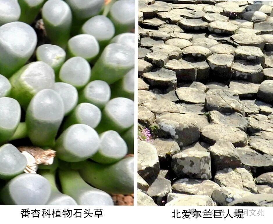 在上海辰山植物园番杏科植物展厅中,当我驻足在“石”字当头的植物面前细致观察欣赏时,蓦然想起,数年前站在北爱尔兰洋岸边“巨人堤”上看到的景象。南部非洲具有生命力的石头草与北部欧洲不具有生命力的石头堤,两者外貌居然如此相似!不愧为大自然艺术工匠鬼斧神工般的奇迹!