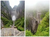 天门洞,位于天门山山体中部,是台地边缘的一个地下溶洞,因向斜构造之力挤压、坍塌、溶蚀,南北两端岩层崩落,裸露天门。三国吴永安六年(263年),山体忽然峭壁洞开,玄朗如门,形成迄今罕见的世界奇观——天门洞。吴帝孙休认为这是吉祥征兆,于是嵩梁山改名为天门山。